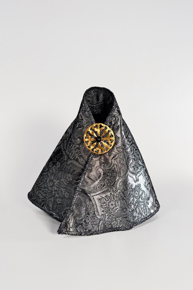 Il manto, in broccato argento, proveniente dall’archivio dell’atelier LAVS di Filippo Sorcinelli, è “sigillato” da un rosone in filigrana metallica dorata con al centro incastonato una sferula in onice.