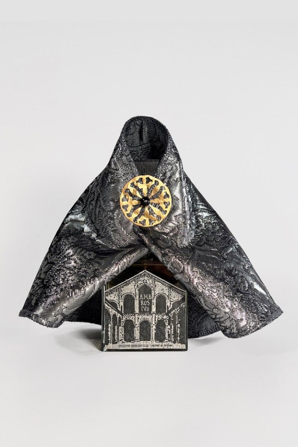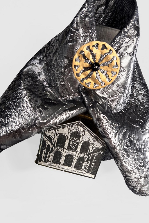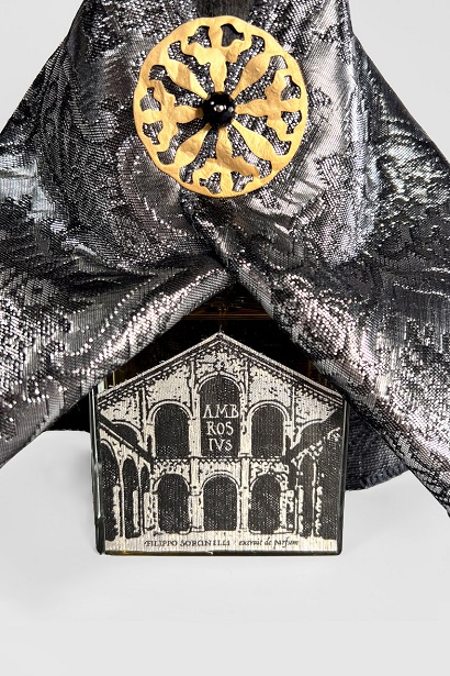 Il flacone riporta la silhouette della facciata della medievale basilica ambrosiana realizzata in tessuto.