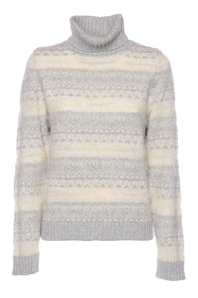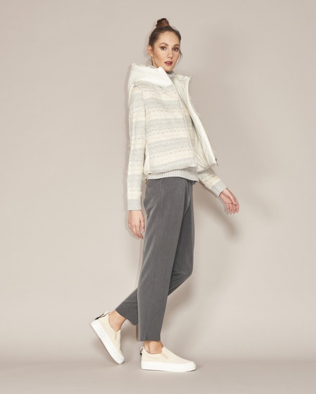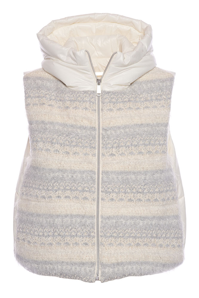 La coppia jacquard, che si fa ammirare di giorno, è formata da un dolcevita in lana merinos, cashmere e seta con lavorazione jacquard a fantasia norvegese e un piumino smanicato in tessuto combinato con inserto nella stessa maglia sul davanti. Ha cappuccio, tasche e chiusura zip. La coppia di lurex, che ama la sera e le occasioni speciali, è formata da un lupetto in luminoso filato di lana merinos e lurex lavorato a nido d’ape e un gilet imbottito in tessuto combinato, con inserto di maglia sul davanti.
