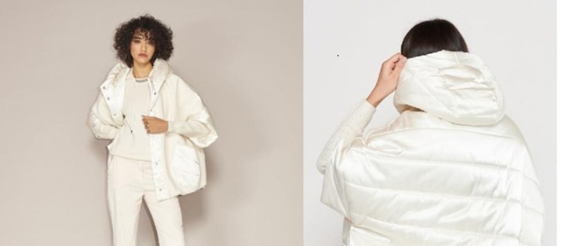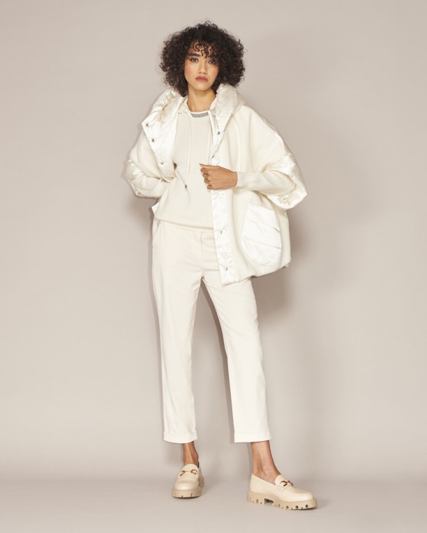 Il piumino ha infatti la spalla scesa, è chiuso da pratici bottoni automatici, è dotato di tasche applicate grandi e capienti in cui affondare le mani e di un cappuccio che regala un’aura misteriosa e poetica insieme (oltre a riparare dalle basse temperature senza rovinare l’acconciatura!).