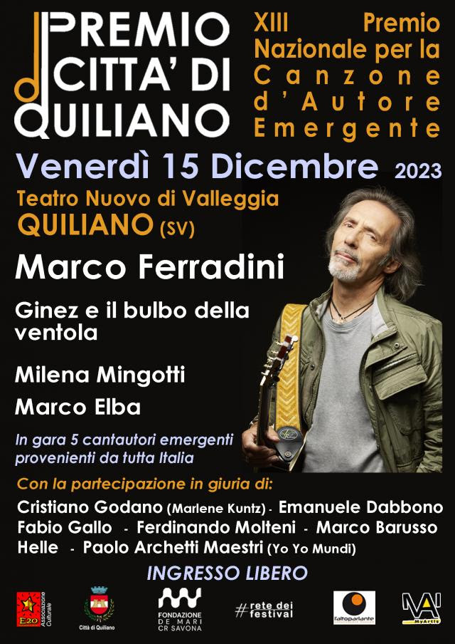 Domani, venerdì 15 dicembre (ore 21), al Teatro Nuovo di Valleggia di Quiliano (SV) la serata finale della tredicesima edizione. Ingresso libero. Premio a Marco Ferradini che si esibirà nel corso dell’evento.