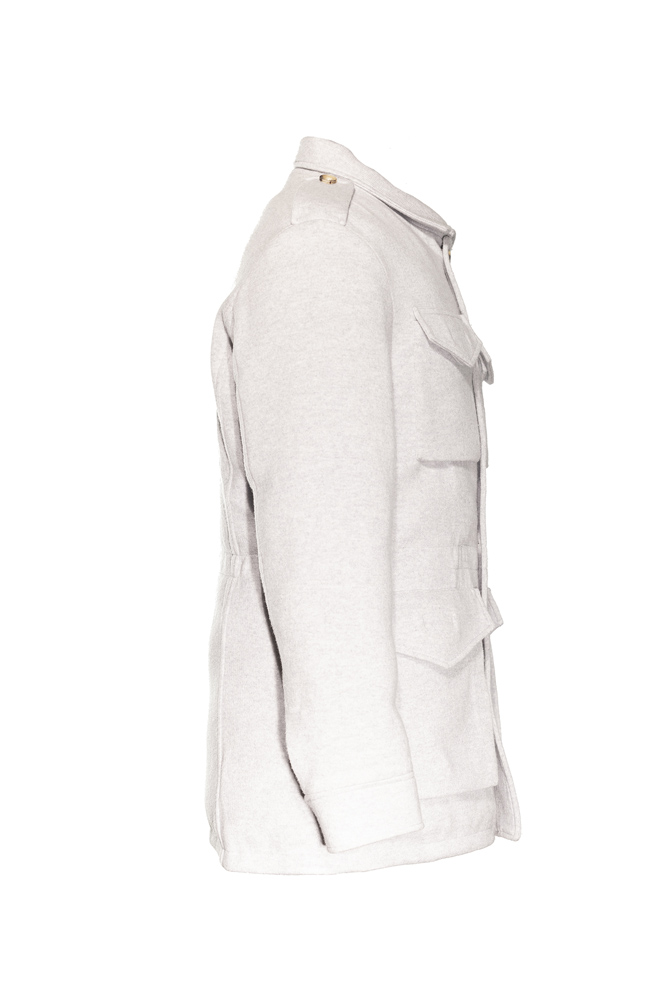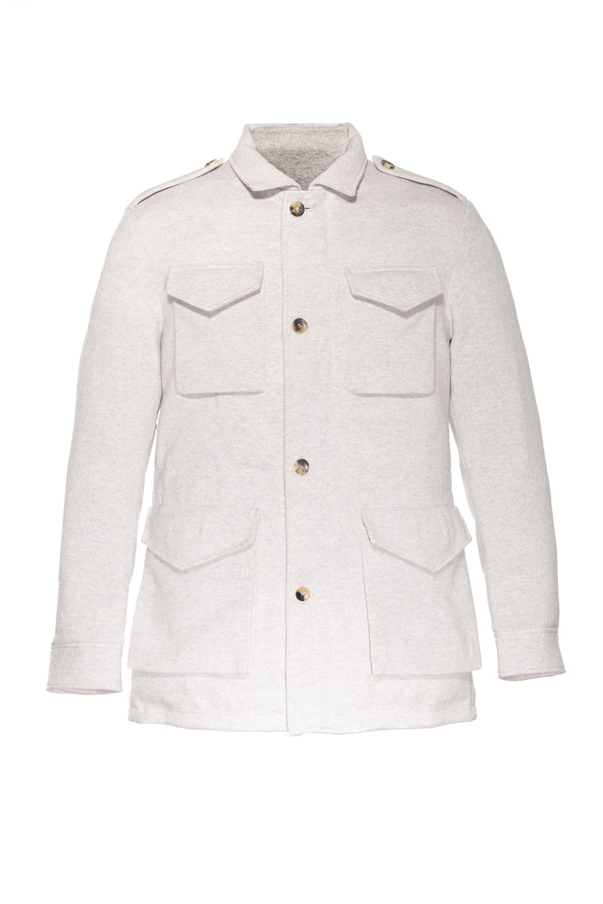 Per realizzare la sua field jacket ha scelto il suo materiale principe, il cashmere: il brand made in Fidenza (PR) guidato dalla quarta generazione della famiglia Somma (la cui azienda è detenuta per il 60% dal Gruppo Kiton) vanta un patrimonio di conoscenze artigianali d’eccellenza in materia di maglieria di lusso.