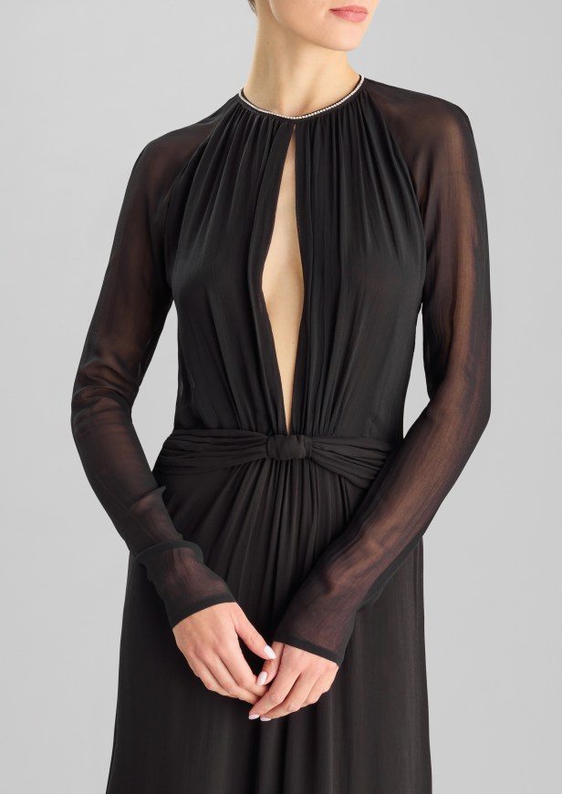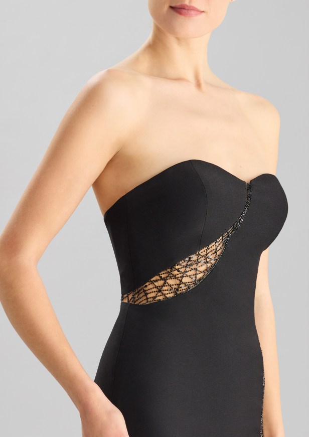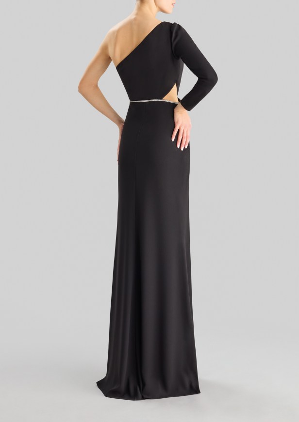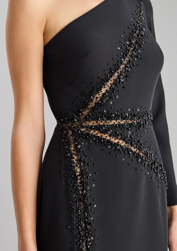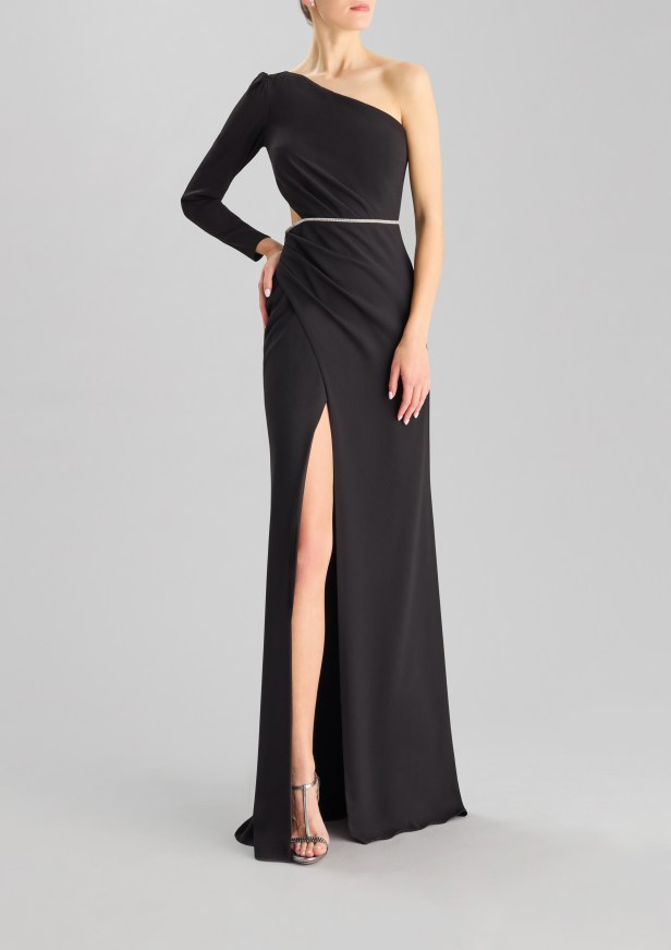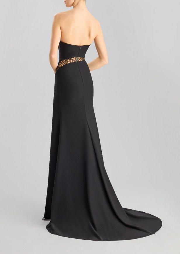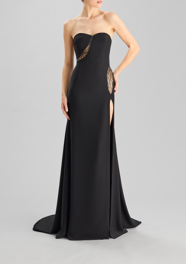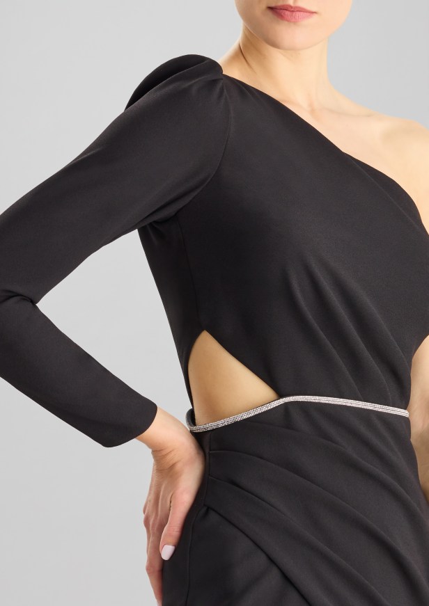 Pelle di tendenza – I seducenti spiragli di pelle che si intravedono profilano le curve e l’inaspettato posizionamento eleva l’elegante abito da sera a sexy party dress.