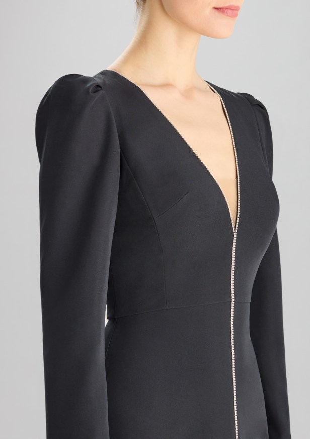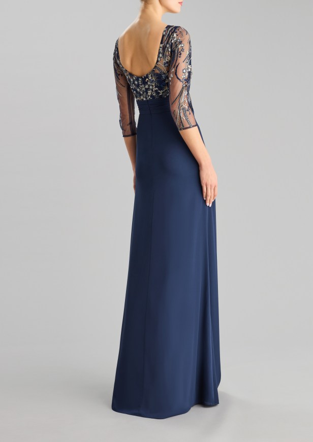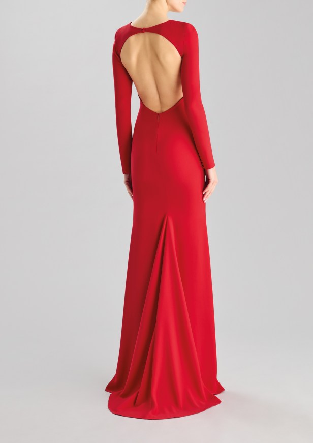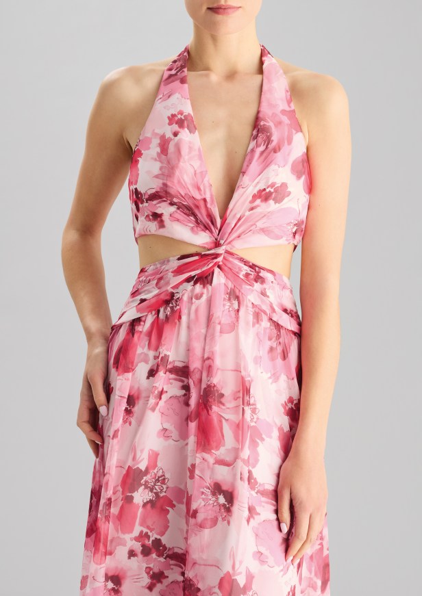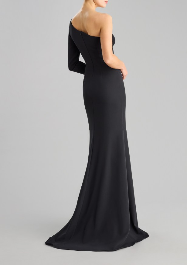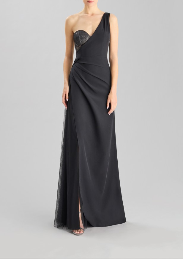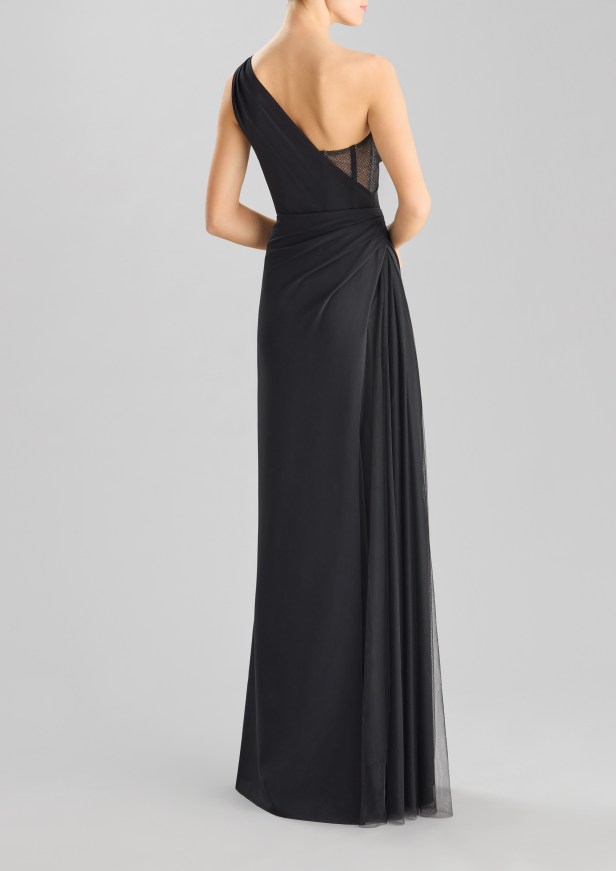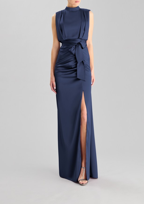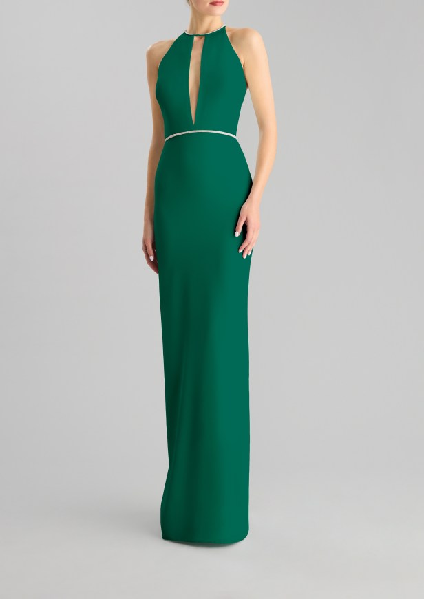 Pelle di tendenza – I seducenti spiragli di pelle che si intravedono profilano le curve e l’inaspettato posizionamento eleva l’elegante abito da sera a sexy party dress.