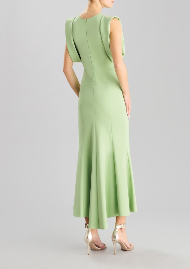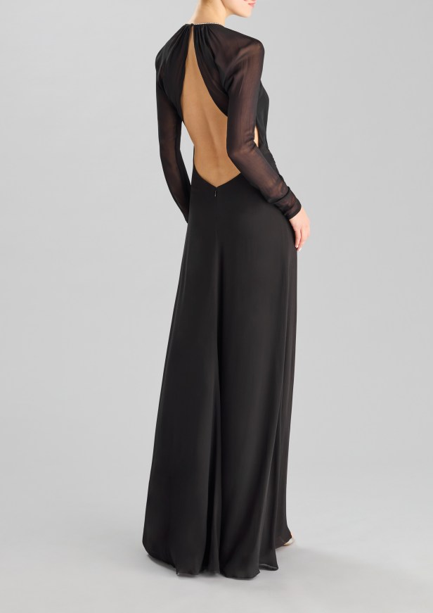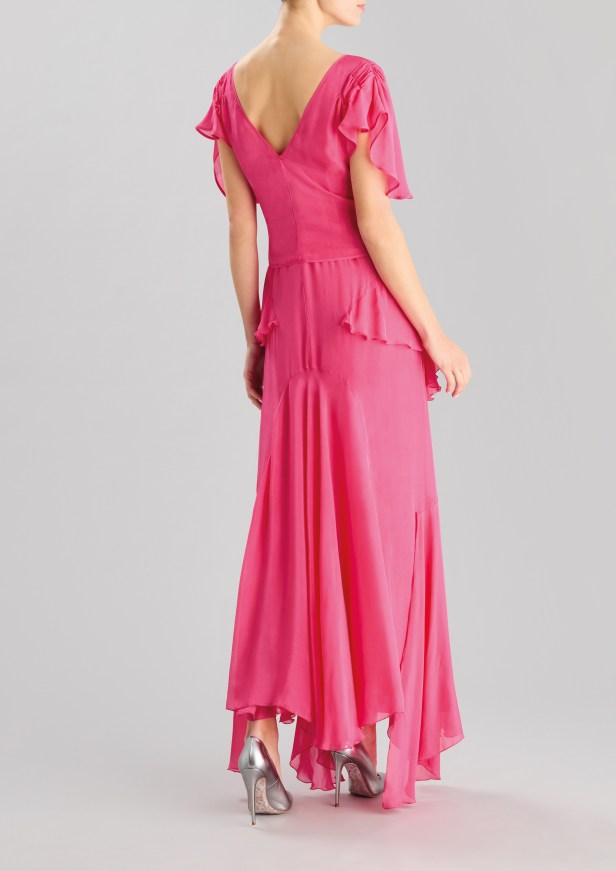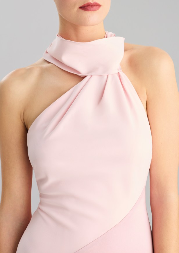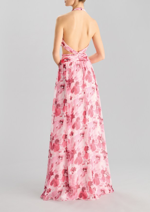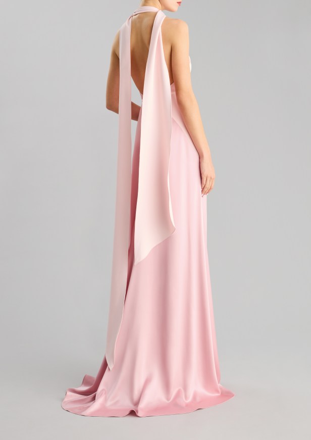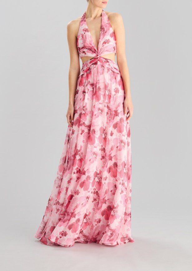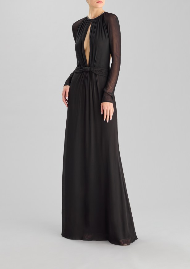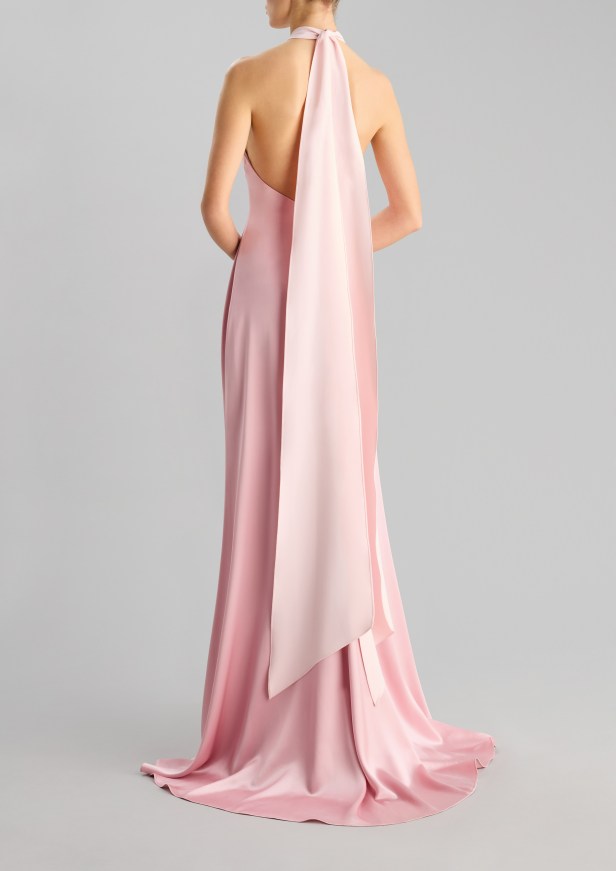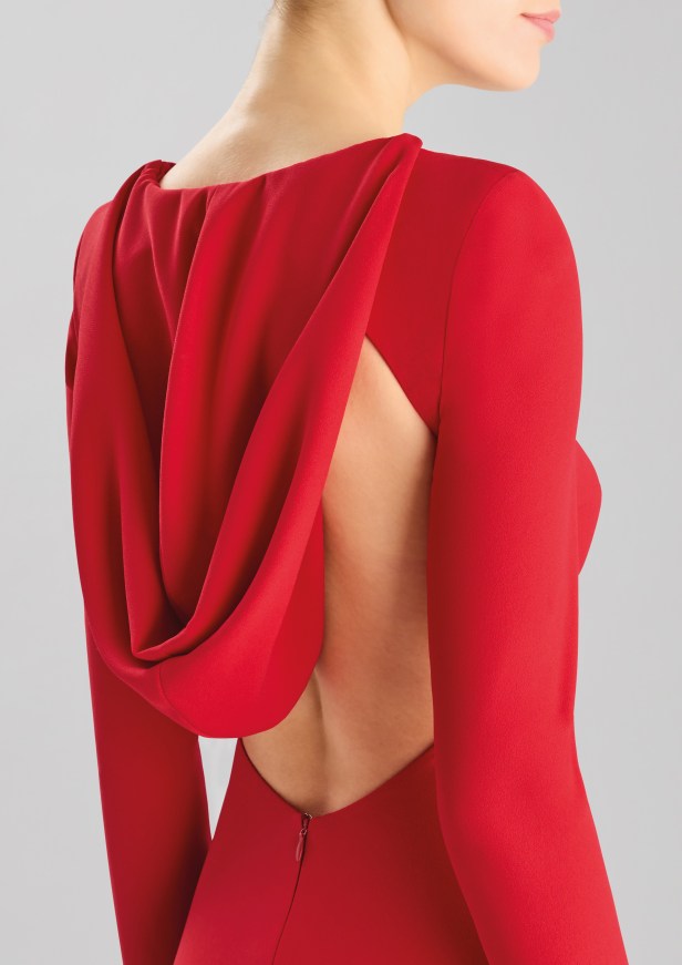 Le silhouette che slanciano il corpo e le gonne a ruota sono rifinite con sensuali spacchi all’altezza delle cosce. I capi più femminili sono caratterizzati da strati fluidi di tessuto, con ruches e arricciature che aggiungono morbidezza a forme più rilassate in tessuti lucenti dai toni pastello e con stampe floreali.