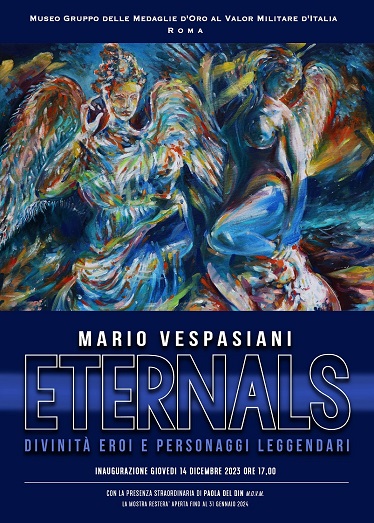 Dopo la memorabile esposizione di Mario Vespasiani al Museo Storico dell’Arma dei Carabinieri è la volta di nuovo appuntamento in una prestigiosa sede istituzionale che per la prima volta accoglie un artista italiano. Aperta il 14 dicembre nel Museo del Gruppo delle Medaglie d’Oro al Valor Militare d’Italia in Roma la mostra personale intitolata Eternals – divinità, eroi e personaggi leggendari, la recente serie di dipinti di una delle personalità più autorevoli del panorama culturale contemporaneo.