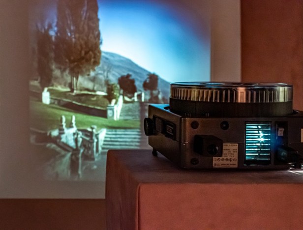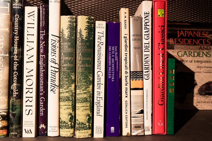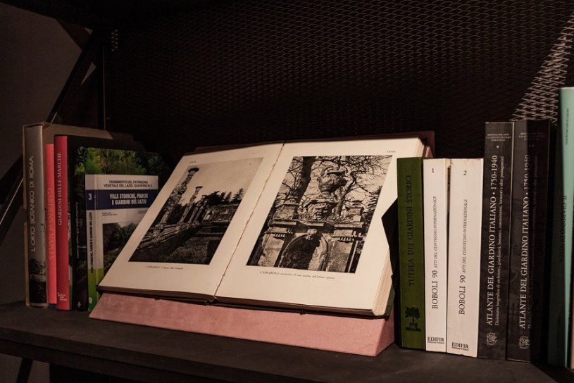 Il guardaroba della Camera Verde si trasforma così in un archivio aperto, un luogo della memoria che conserva testimonianze che si presentano come materiale di studio con cui il visitatore è chiamato ad interagire. Una selezione di sessanta volumi – della vasta collezione di quasi un migliaio di libri dedicati al giardino, al paesaggio e al mondo botanico raccolti dall’architetto nel corso della sua vita – diventa una biblioteca aperta al pubblico. Sulla parete centrale le diapositive dei suoi viaggi si alternano e mettono in luce la metodicità di approfondimento e l’indagine sulle diverse tipologie di verde.