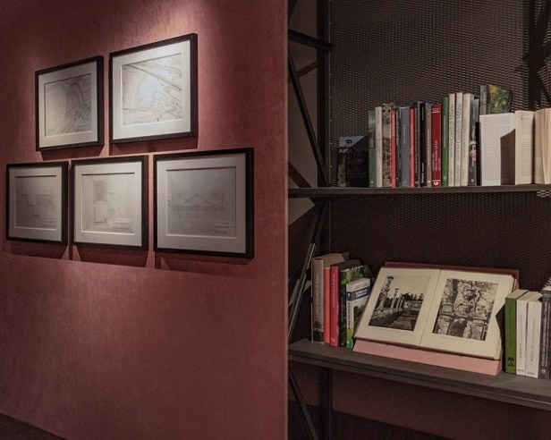 Sulle pareti laterali due eccezionali progetti indagano l’uno il tema del giardino privato, l’altro quello dell’architettura di paesaggio. Il primo pone in evidenza la scrupolosità con la quale l’architetto approccia il tema del giardino studiando accuratamente la disposizione delle diverse specie botaniche al fine di creare un ambiente armonioso. Il secondo testimonia l’impegno profuso da Pier Fausto nei lavori di riqualificazione paesaggistica; in particolare, il progetto extra moenia del Parco archeologico di Pompei che prevedeva la valorizzazione del legame tra gli scavi e il paesaggio naturale circostante.