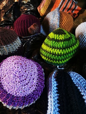 I cappelli sono realizzati con un filato lana/acrilico (50% e 50%) ed è possibile scegliere colori, texture e accessori; allo stesso modo è possibile fare per le spille.