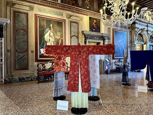 Proprio la seta è protagonista a Palazzo Mocenigo con l’esposizione nel portego di una ventina di abiti, creazioni originali, tessuti e fedeli repliche di antichi abiti provenienti dal Museo della Seta di Suzhou, centro di primaria importanza per la ricerca, la tutela, la conservazione e la protezione della millenaria tecnica di tessitura che rese celebre la seta della regione dello Jiangnan.