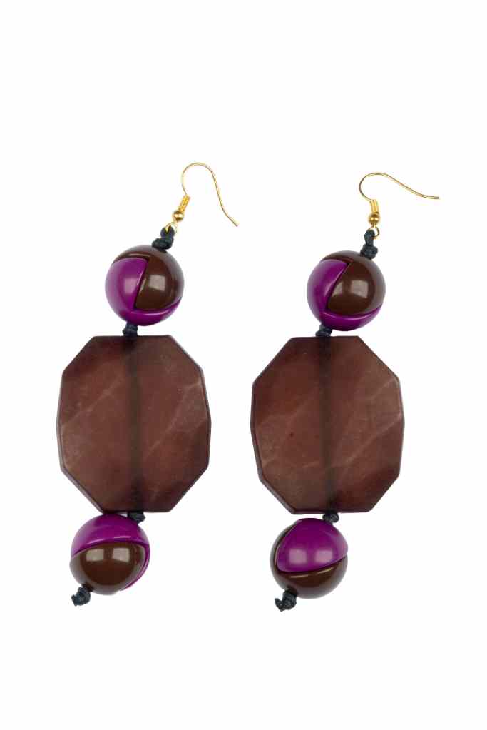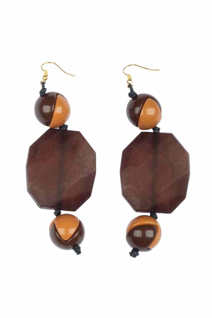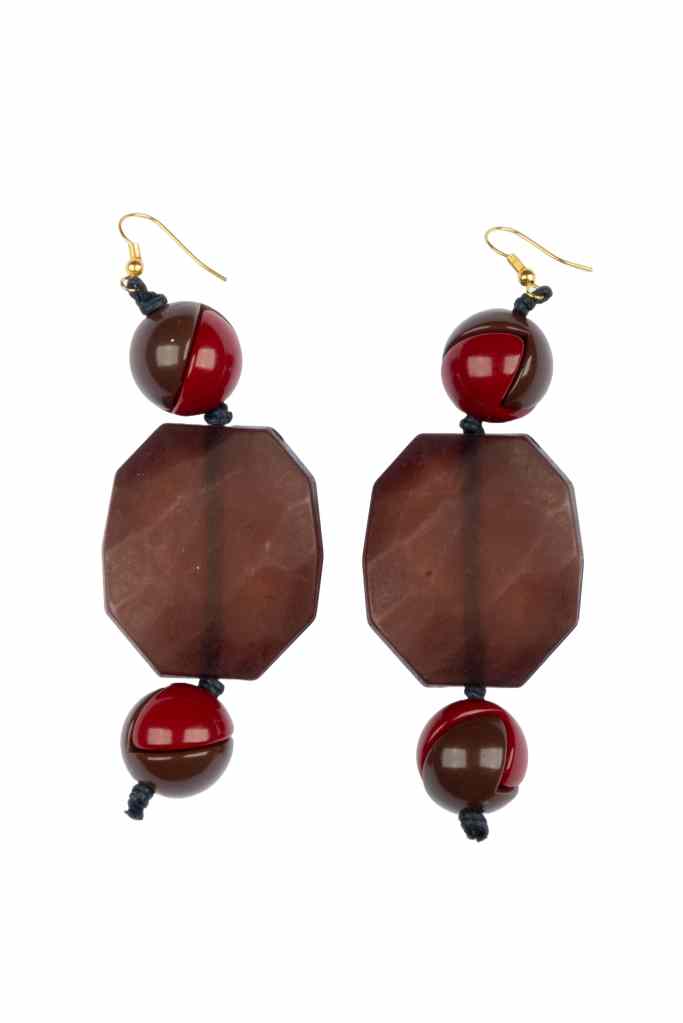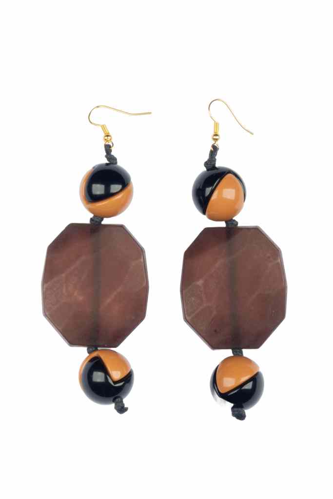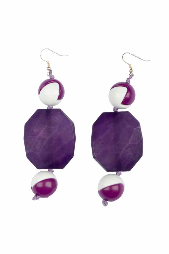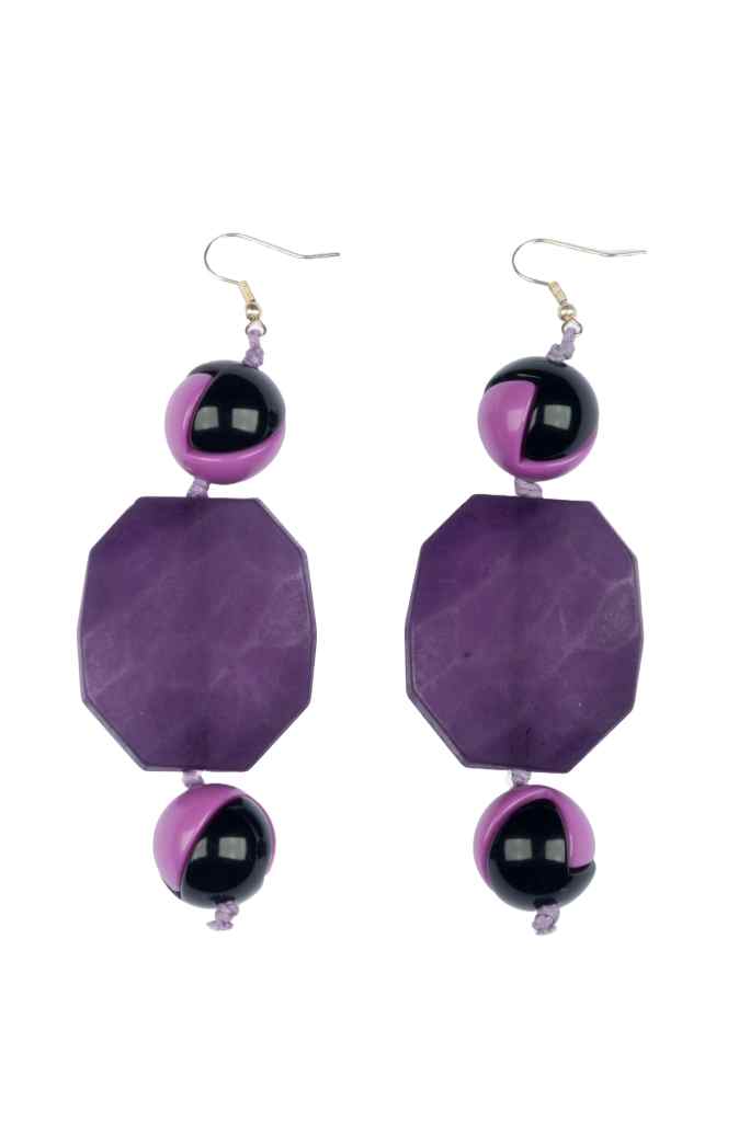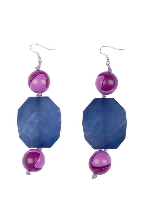La collezione di orecchini FANTASY OF EARRINGS si basa su questi pezzi molto grossi, accompagnati da boule “spezzate”, che insieme giocano con i colori, più chiari, più scuri, con tonalità simili: ocra, ottanio, testa di moro e viola, interamente lavorati e colorati a mano e realizzati in plastica riciclata.