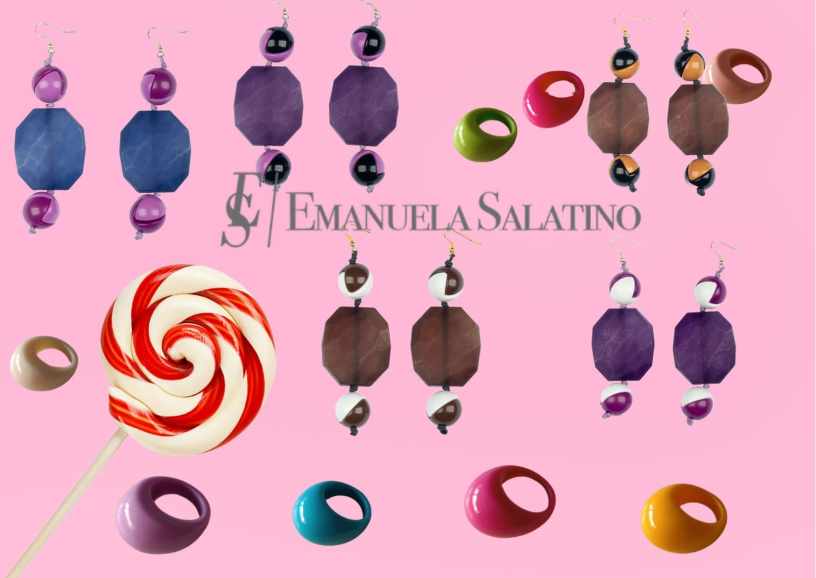 Colorati, divertenti, allegri sono i nuovi orecchini e anelli dall’aspetto caramella di Emanuela Salatino, un mondo giocoso quello della famosa designer che fin da piccola realizzava vestitini e gioiellini per le bambole che poi regalava alle sue amichette.