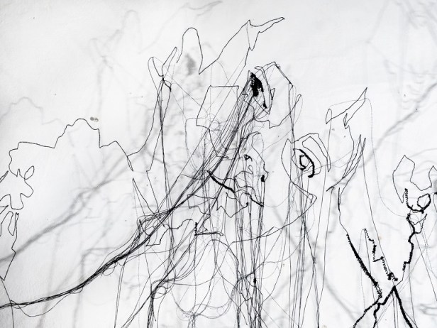 Nelle immagini: Lucia Bubilda Nanni - ORAMA (particolare), 2023 - installazione modulare - filo, stoffa - disegno a mano libera con macchina da cucire Bernina modello 1008 meccanico a pedale - ph. credit Marco Parollo