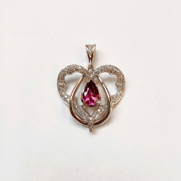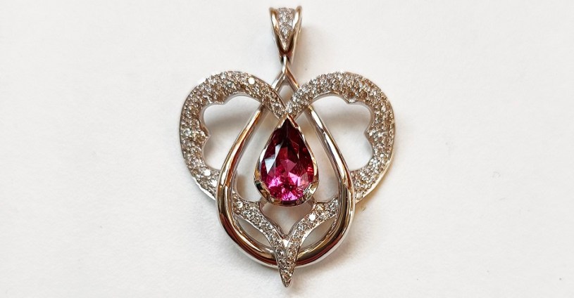 “Goccia d’Amore” firmato Ivan Barbato è un pendente, realizzato in oro bianco con pavè di diamanti e tormalina a goccia, composto da un delicato intreccio di dettagli in oro lucido e altri impreziositi da brillantini.