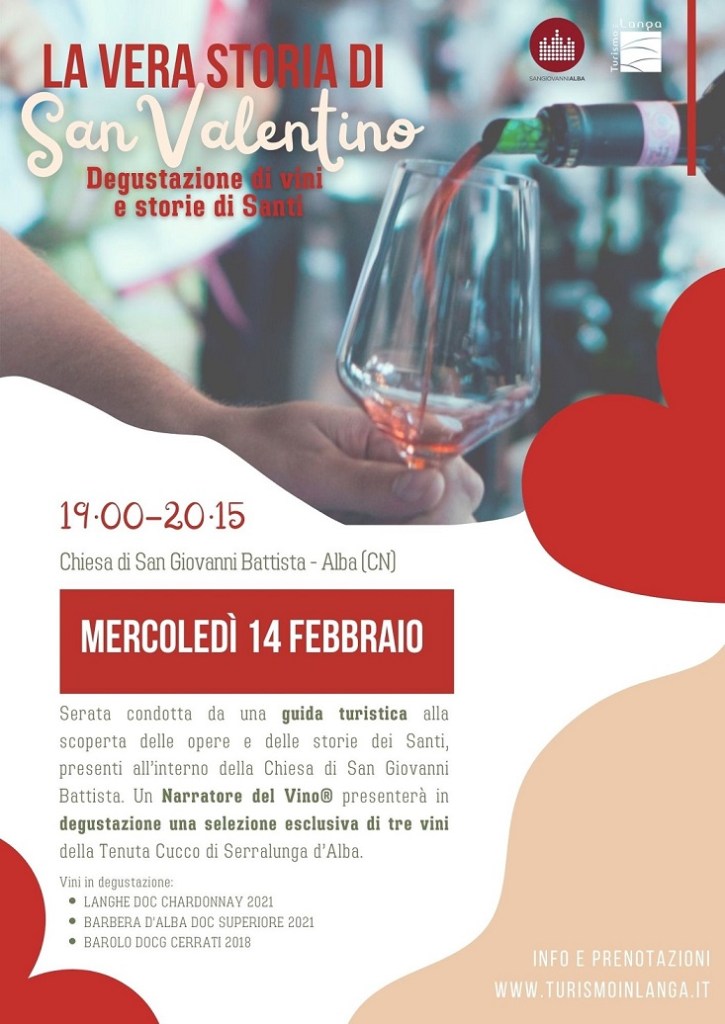 Nello Spazio San Giovanni, adiacente alla Chiesa di San Giovanni Battista, in Piazza Pertinace 4 ad Alba (CN), dalle ore 19.00 alle ore 20.15, si festeggerà il Santo protettore degli innamorati con un seminario esperienziale tra storie di Santi, patrimonio artistico e enologia.