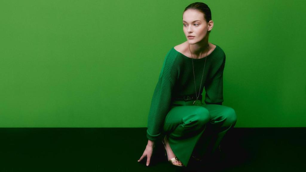 Capi dalle tinte cromatiche del blu klein e verde parakeet, capi essenziali del guardaroba come tailleur blazer/pantalone, cappotti caban e abiti dal taglio lineare, proposti a contrasto con accessori color avorio.