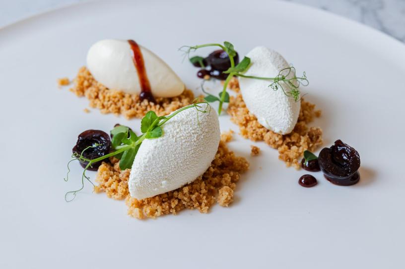 Mousse di ricotta dolce, amarene e croccante alla vaniglia