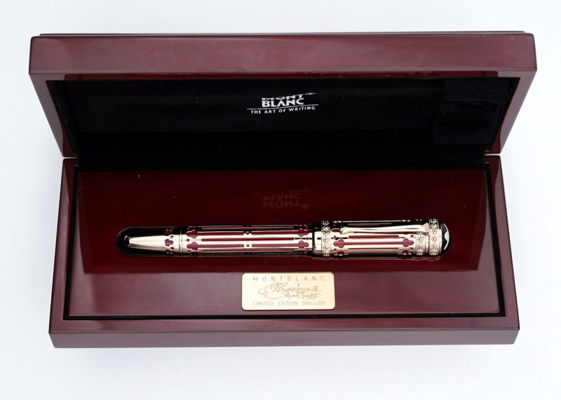 È dedicato a Caterina la Grande, imperatrice di Russia, il lotto 234, la stilografica Montblanc Catherine The Great Patrons Of Art, dal corpo in resina color vinaccia con finiture in oro rosa e cappuccio decorato con ghirlande di fiori. Questo tributo alla passione per le arti e all’influenza sulla cultura russa dell’imperatrice ha una base d’asta di 1.200 Euro. Parte invece da 1.000 Euro l’offerta per aggiudicarsi la stilografica dedicata da Montblanc a Carlo Magno (lotto 250), realizzata in collaborazione con la Cattedrale di Aquisgrana, dove il Re dei Franchi fu incoronato imperatore del Sacro Romano Impero.