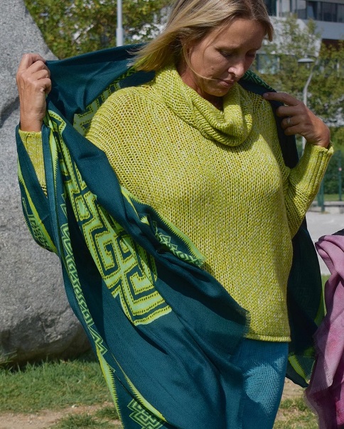Stola in cashmere light Esplosione di colore: in cashmere extrafine, si riconosce subito per la stampa di un’opera dell’artista Alice Rabbi. Il disegno si estende su una base che esplode di colori, dal rosa al fucsia, e dal giallo all’arancio.