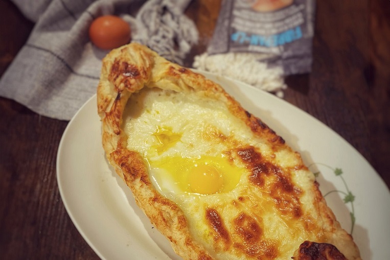 Il gustosissimo Khachapuri, un lievitato di pane con formaggio e uova dalla speciale forma “a barchetta”.