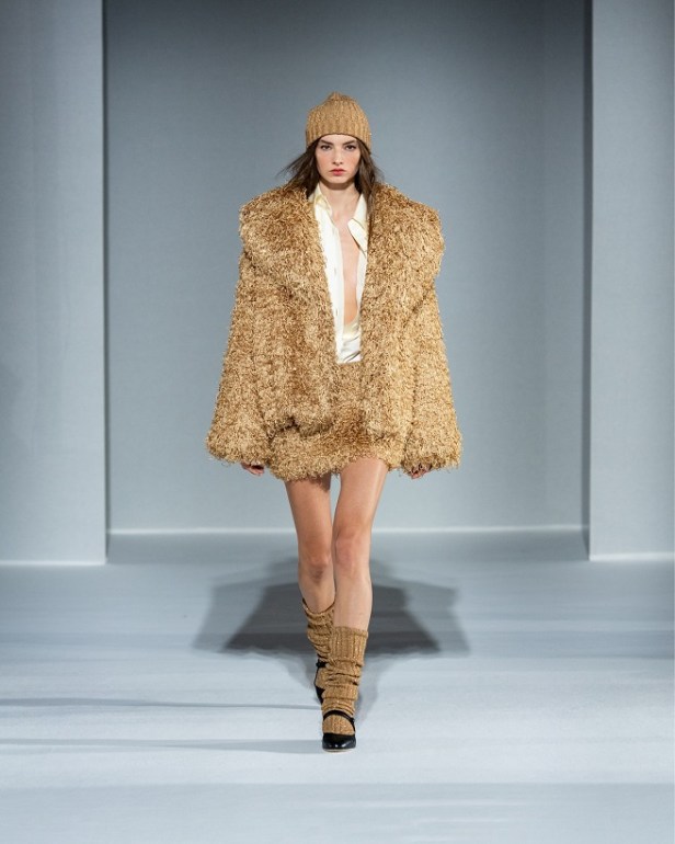 Caldi filati in micro-paillettes dorate modellano così maxi pellicce con minigonna abbinata, abiti aderentissimi e lunghi cardigan doppiopetto.