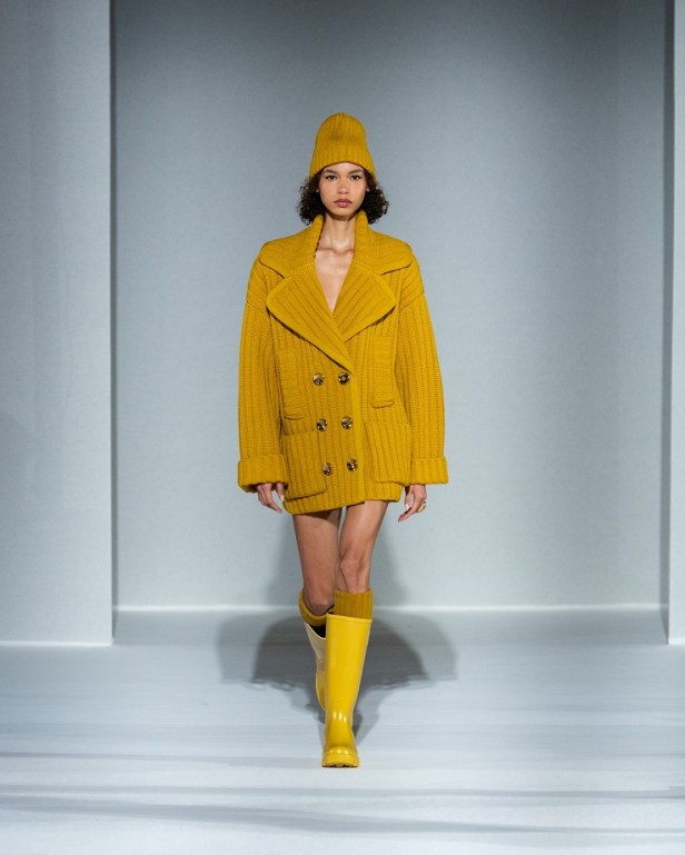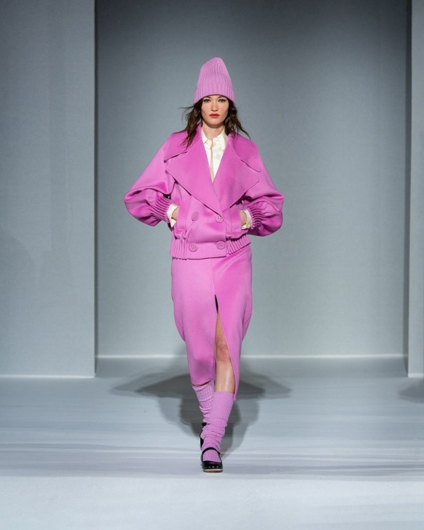 Proseguendo sui passi di una disinvolta raffinatezza fra tailleur in pizzo di lana, abiti in più strutturata maglia a collo alto e, per la sera, un principesco long dress rosa baby in mohair.