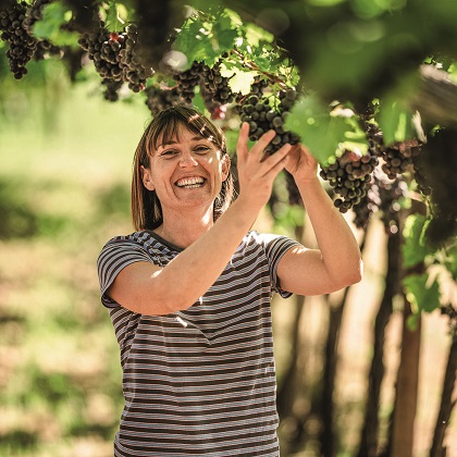 Nathalie Bellutti, prima di diventare contadina nel maso Ansitz Rynnhof di Termeno, che per Gallo Rosso produce vini di ottima qualità, ha studiato scienze agrarie a Vienna; negli anni di studio si è concentrata sulla viticoltura e in particolare sulla protezione delle piante. Dopo essersi laureata, ha lavorato diversi anni nella ricerca, ma nel 2015 ha deciso di andare a lavorare al maso con suo padre, indirizzandolo verso l’agricoltura biologica e Bioland. Dal 2021 è Nathalie a gestire il maso con l’aiuto di suo marito: 3 ettari di viti, da coltivare con gli ostacoli delle temperature estreme, delle malattie e dei nuovi parassiti, e l’intero processo dalla viticoltura fino alla vendita del vino. Grazie al solido lavoro di squadra, al coraggio di intraprendere alcuni cambiamenti e ad una certa sensibilità femminile, Nathalie porta avanti il maso con orgoglio, riuscendo a conciliare l’essere madre al lavoro. Inoltre, si è guadagnata un ruolo importante nel business del vino, dominato tutt’ora dagli uomini.