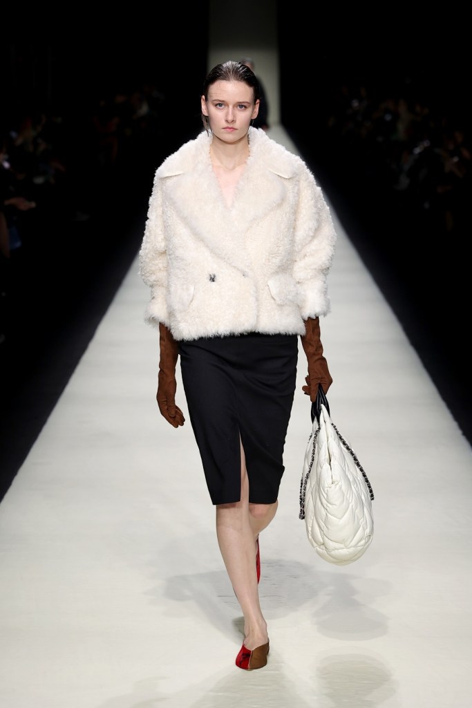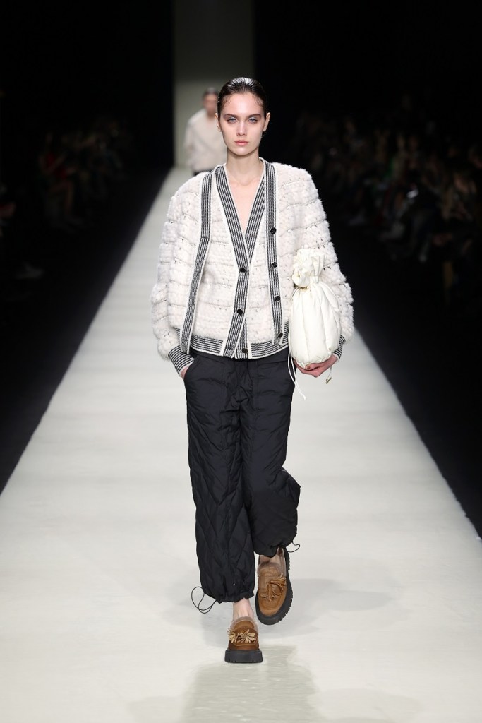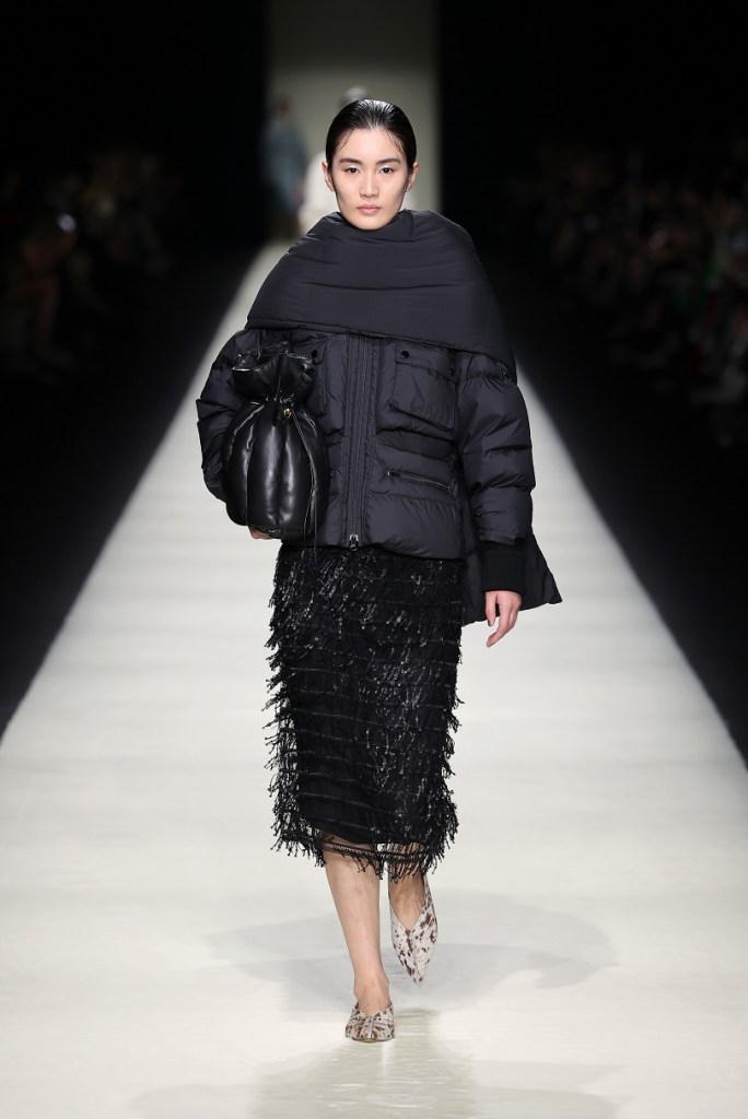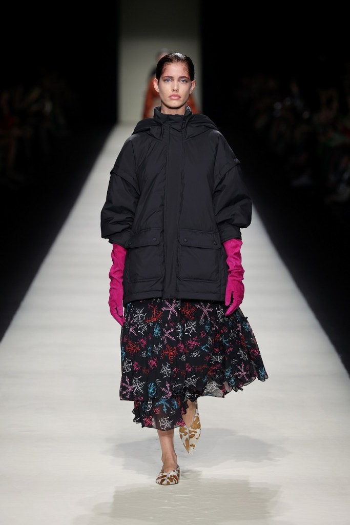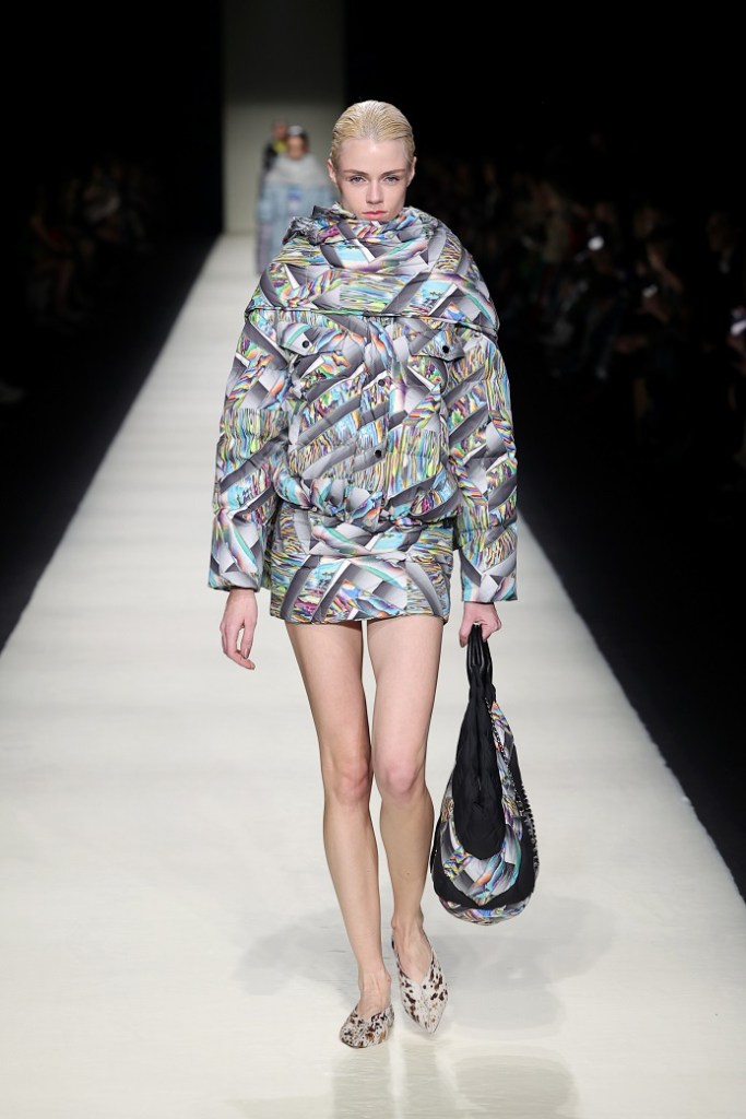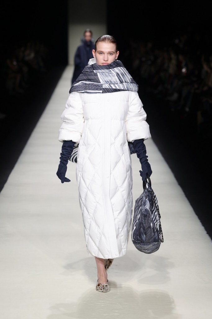 Così le tracce sulla neve si mutano in habotai di seta stampata in bianco e nero; i paesaggi montani, gli scorci da cartolina, le cromie del rosa, del bianco, del blu indaco disegnano abiti in chiffon e amplificano il carattere dei piumini, mountain clothing per eccellenza, oltre che quello delle puff bag e delle sciarpe trapuntate.