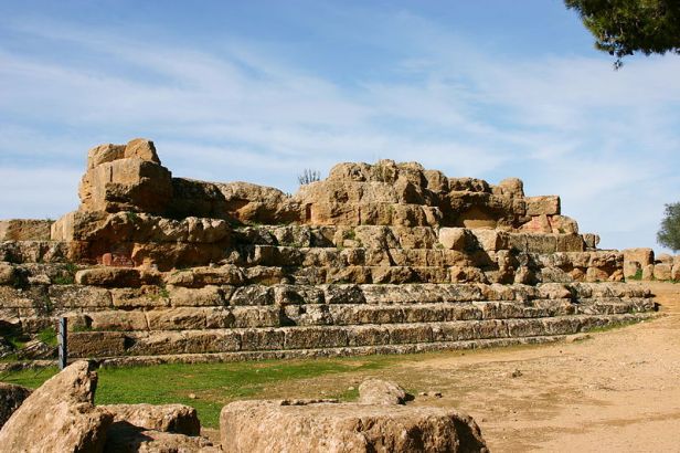 Il tempio di Zeus Olimpio sorgeva a sud della città antica, sulla parte occidentale della collina dei templi. Venne eretto in segno di ringraziamento per la vittoria di Akràgas sui Cartaginesi dopo il 480 a.C. per celebrare il prestigio del tiranno Terone. Furono escogitate soluzioni architettoniche mai viste prima, come le altissime semicolonne scanalate, in ognuna delle quali "poteva stare comodamente un uomo" (scrive Diodoro Siculo). Di dimensioni colossali, basti pensare che misurava circa 112 x 56 metri (il Partenone ad Atene misura 69,54 x 30,87 m.), occupava 6340 mq e fu realizzato in blocchi di calcarenite locale. A pianta inusuale (pseudoperipteroeptastilo, 7 semicolonne doriche sui lati corti e 14 sui lati lunghi), con l'architrave, composto da tre filari di blocchi, sormontato da un fregio dorico, dal geison e dalla sima. Negli spazi tra le colonne (intercolumni), a circa 11 metri d'altezza, erano posizionate le statue monumentali (telamoni) nell’atto di reggere con le braccia un gravoso carico. Il tempio fu irrimediabilmente compromesso da un terremoto nel 1401, poi depredato nel XVIII secolo e i suoi blocchi utilizzati per costruire il molo di Porto Empedocle.