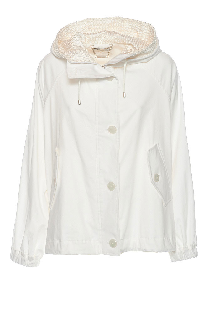 Casual, chic e sofisticato, il parka corto di ROCCO RAGNI è pura luce, di cotone bianco come la spuma delle onde e, oltre a tutti i dettagli curatissimi che lo definiscono, è caratterizzato da un maxi cappuccio foderato di rete in filo di cotone. Un dettaglio lussuoso che avvolge ed enfatizza il viso una volta indossato.