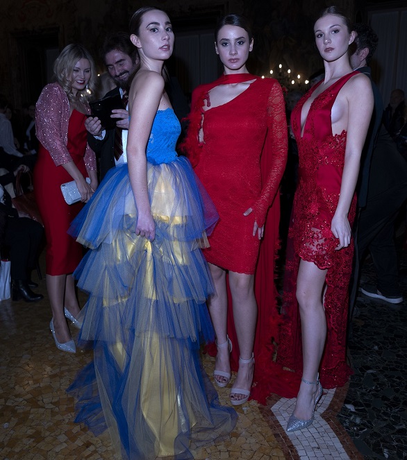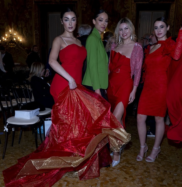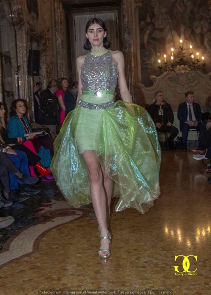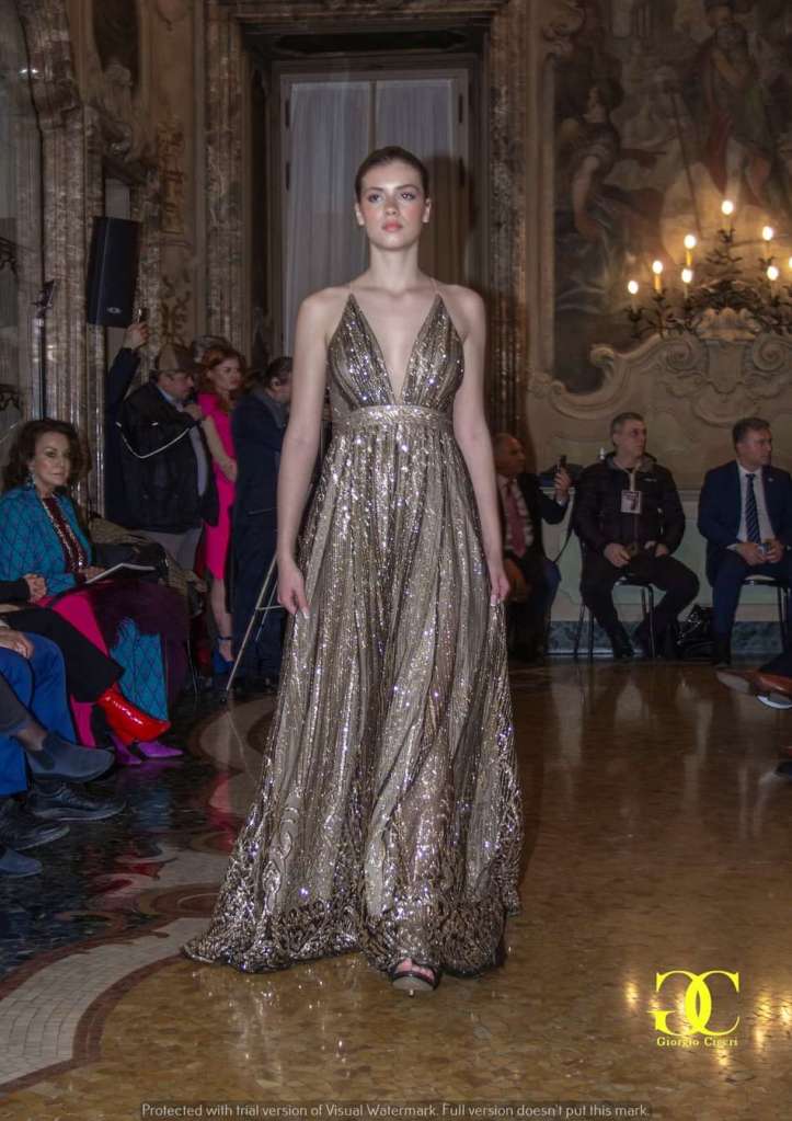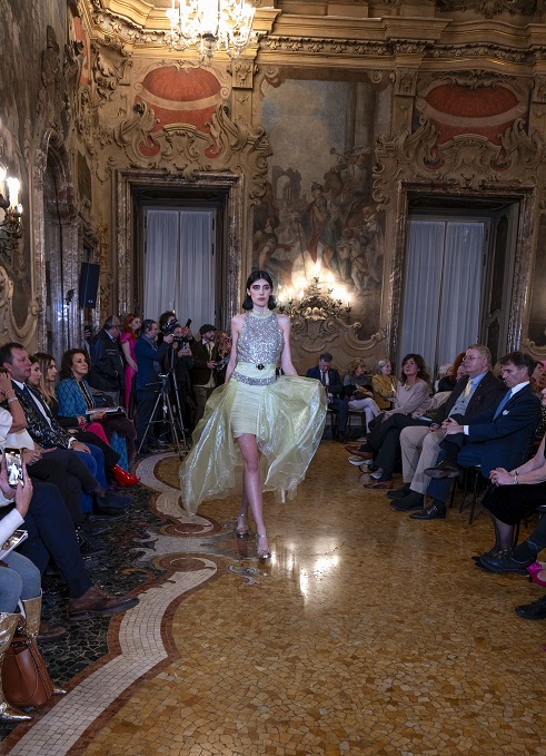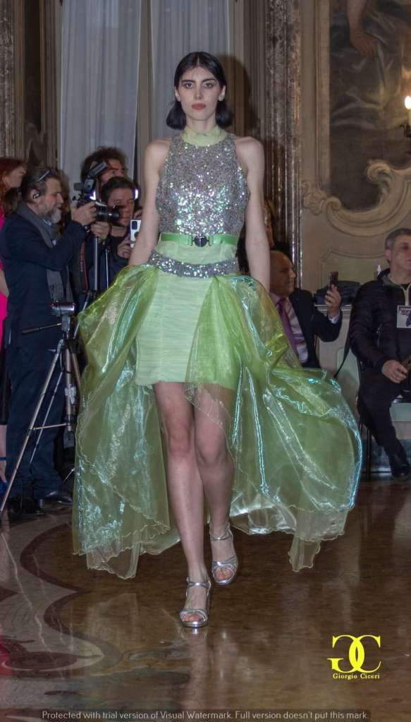 La scenografia di Palazzo Visconti ha aggiunto un ulteriore livello di fascino all’evento, con i suoi spazi sontuosi e ricchi di storia che hanno fatto da sfondo alle belle modelle di Miriam Tirinzoni, creando un dialogo unico tra passato e presente, tra arte e moda.