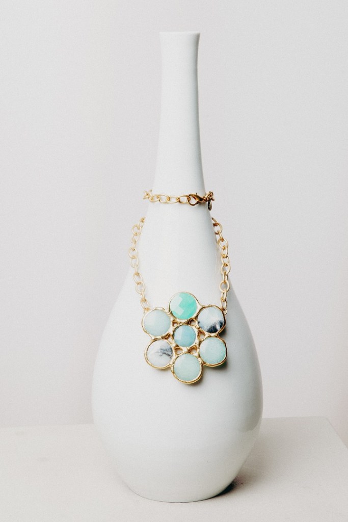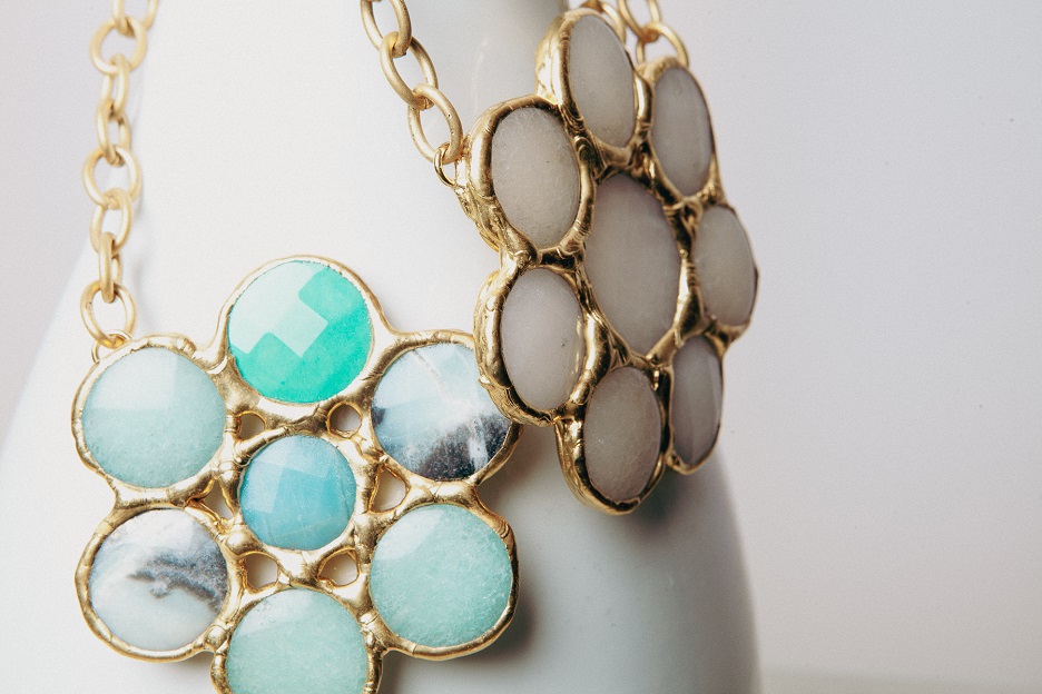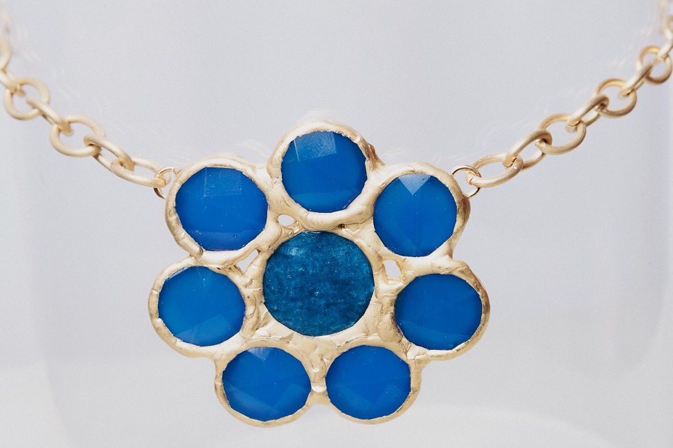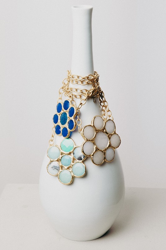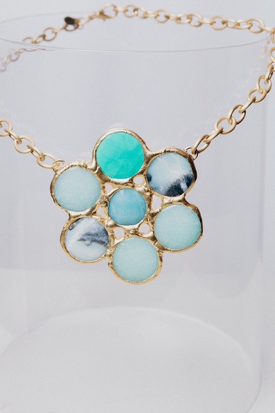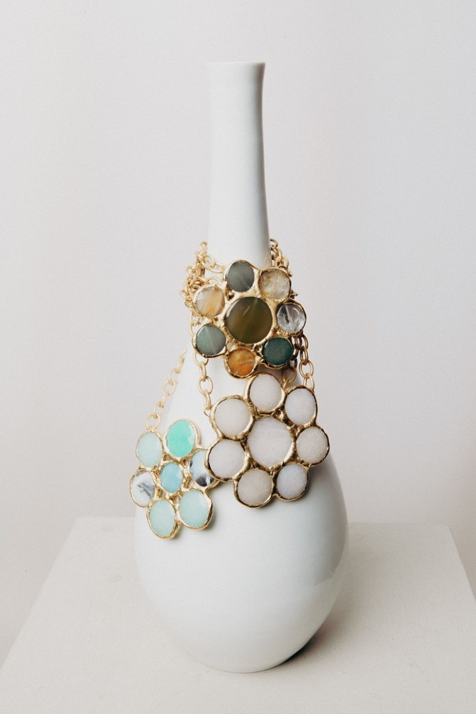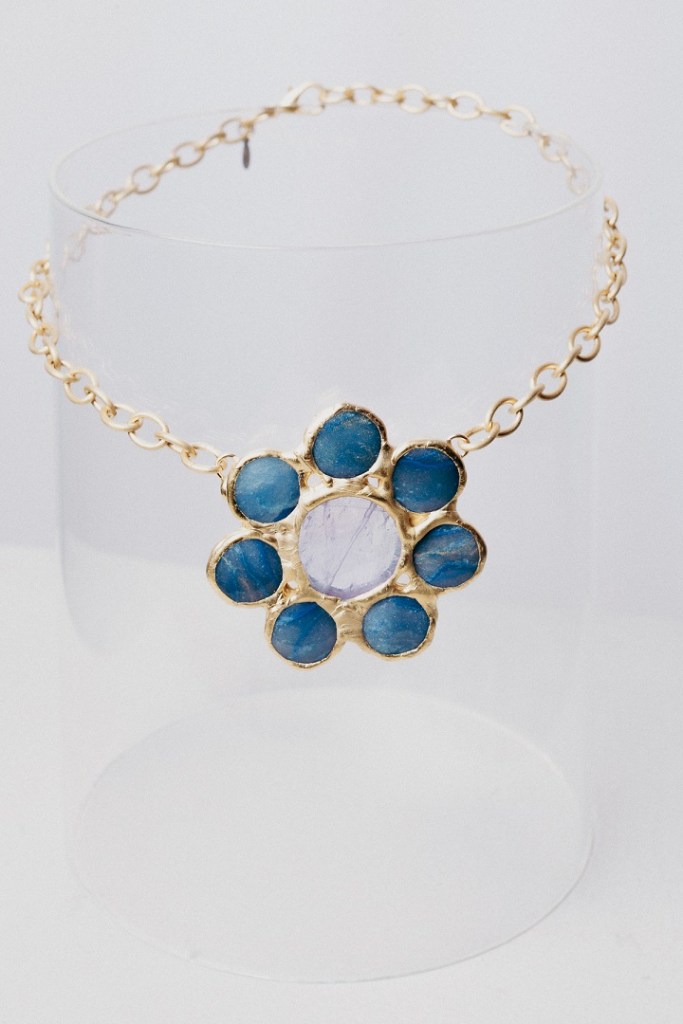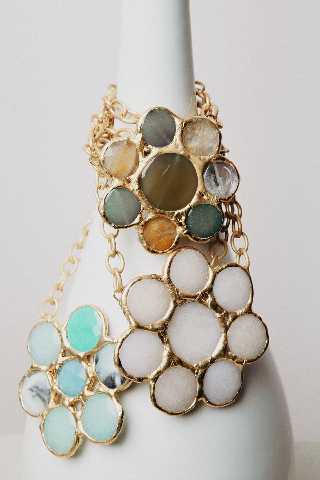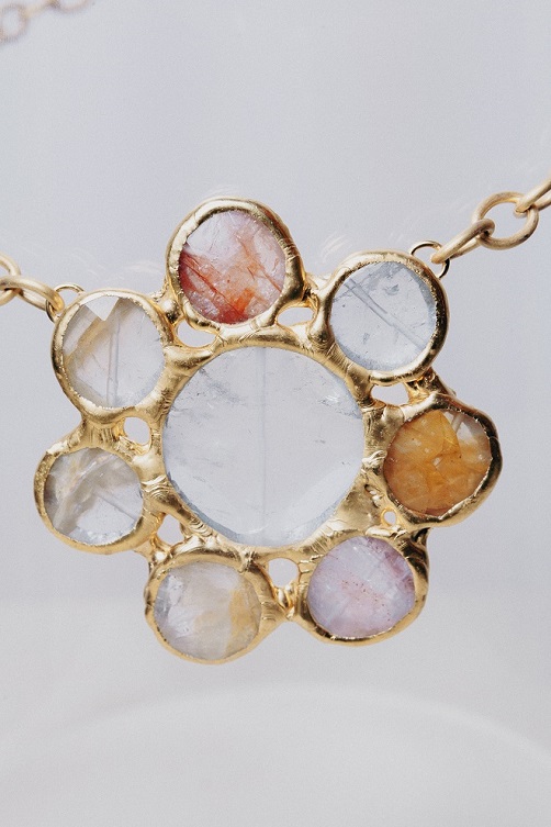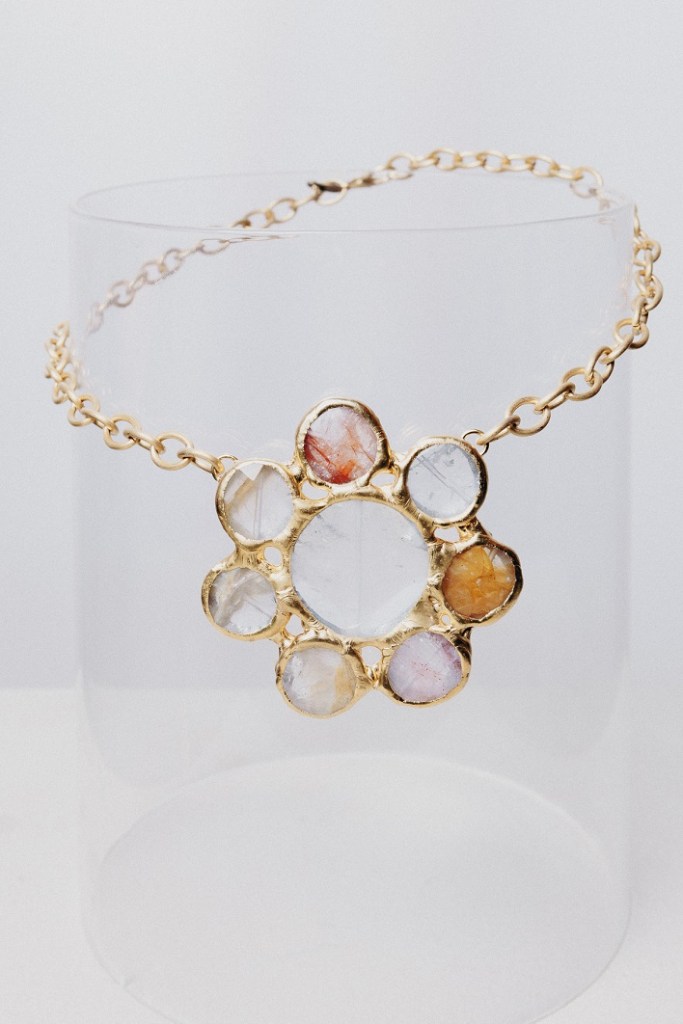 A cominciare dalla prima proposta di collier creata all’insegna della primavera e del suo simbolo, il fiore, sulla cui struttura in oro opaco 23 carati si “posano” petali di pietre diverse dalle mille sfumature – dal quarzo al cristallo, dall’agata all’angelina – per dare vita a un caleidoscopio cromatico di forte impatto.