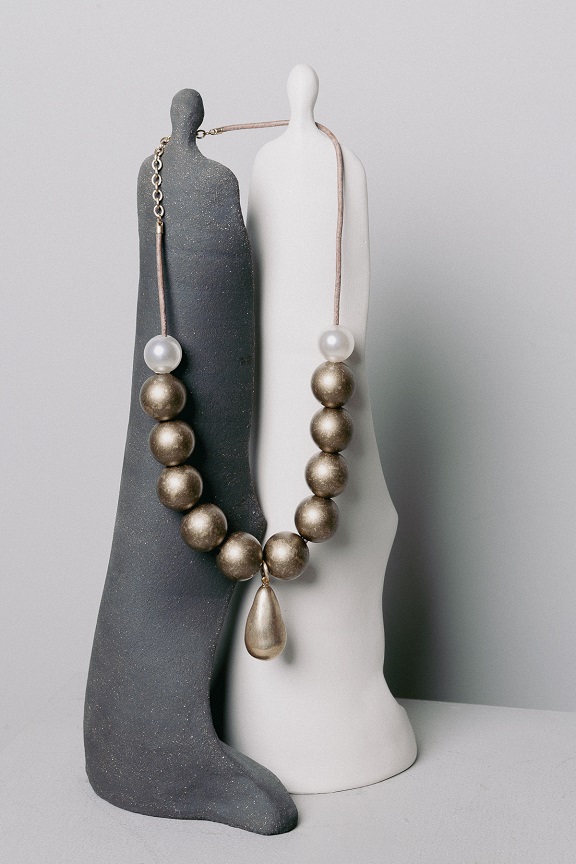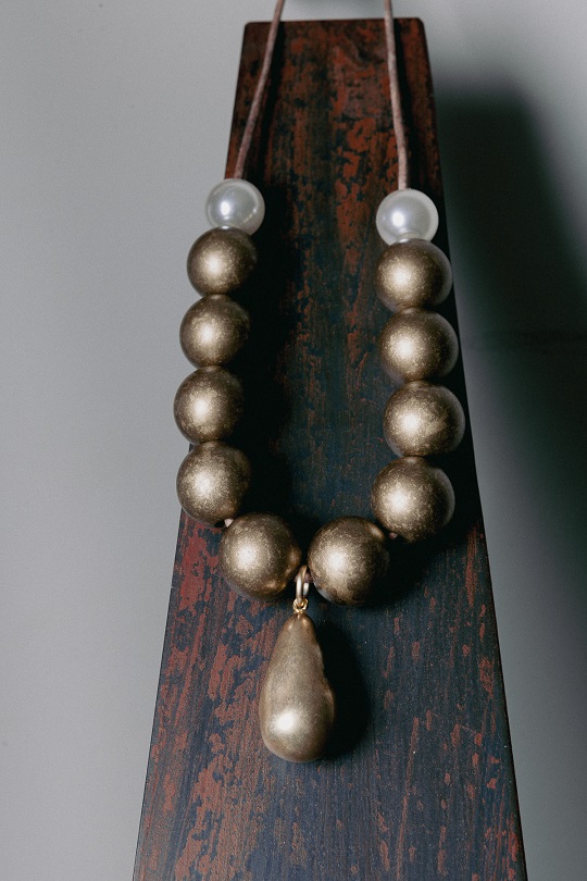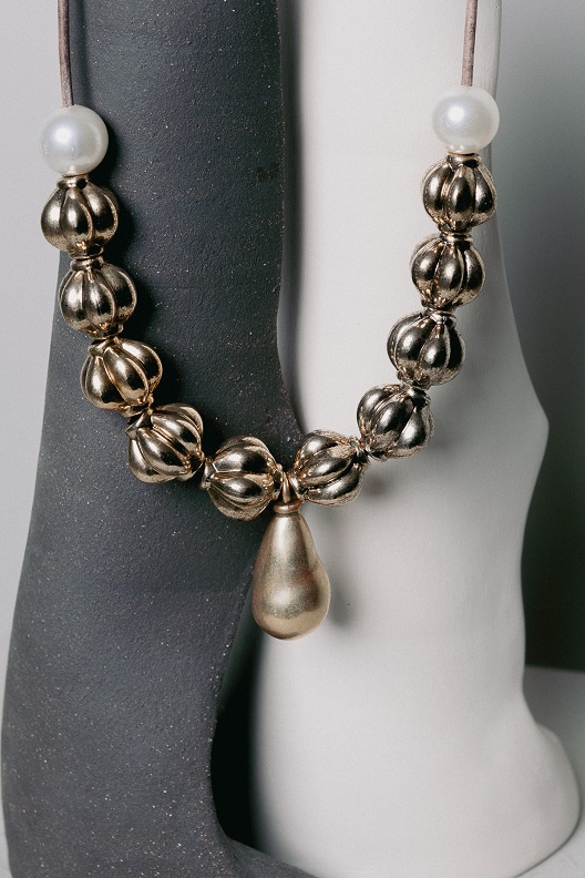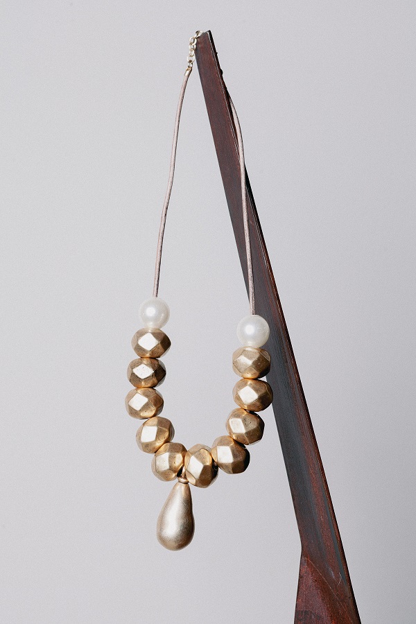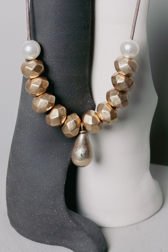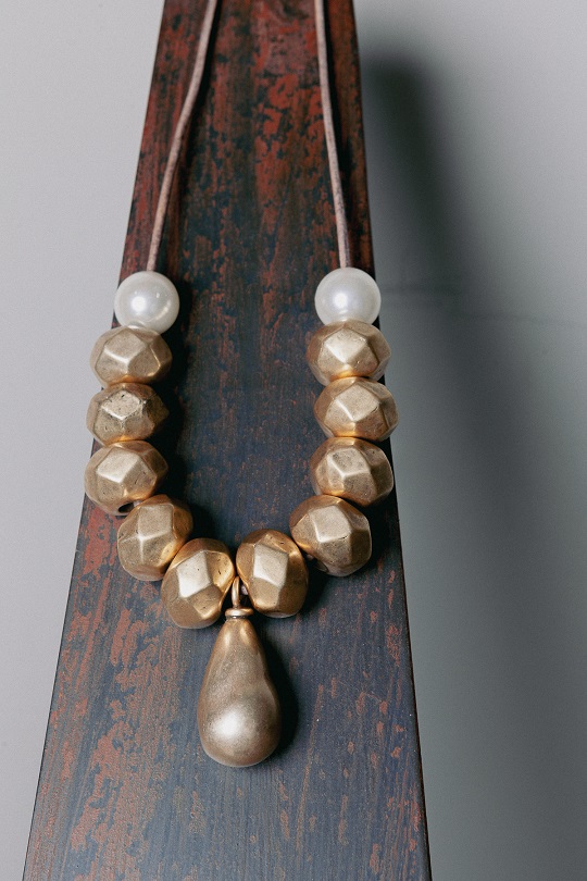 Un incontro tra Oriente e Occidente è quello realizzato dalla seconda capsule in cui un filo di cuoio vintage accoglie tre diversi design di girocolli, tutti accomunati dalla presenza di differenti boules di resina – in oro spazzolato antichizzato italiano; con taglio a bullone provenienti da Agadir; antichizzate con taglio ad anfora e originarie di New York -, da perle e da una boule di resina dal taglio “a pera” in oro antichizzato.