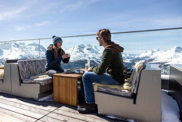 Qui ci si può sedere sulla terrazza panoramica del Romantikhotel Muottas Muragl https://www.muottasmuragl.ch/en/food-drinks/panoramaterrace/ , oppure anche lungo i sentieri escursionistici invernali su una delle tante panchine – sempre provviste di coperte – https://www.mountains.ch/en/winter/more-winter-activities/winter-hiking/ o infine – anche su una delle sedie a sdraio con tettuccio tipiche del Mare del Nord e del Mar Baltico – che sono strategicamente posizionate proprio sopra la terrazza.