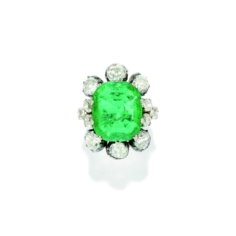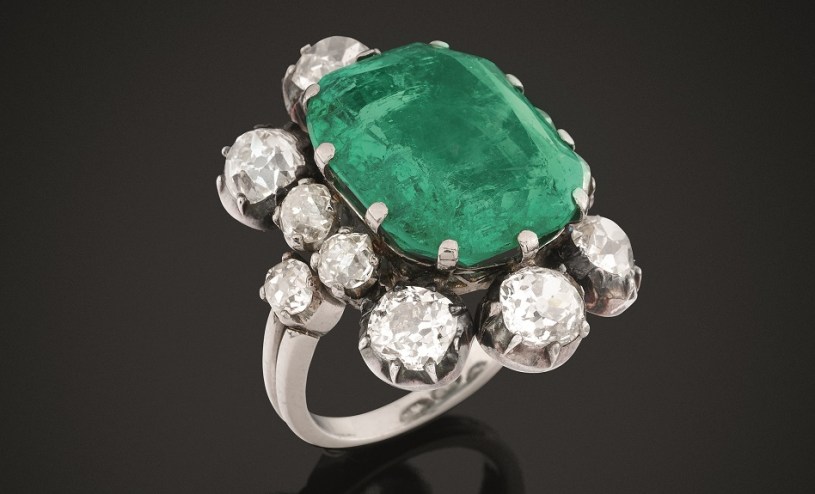 Di grande eleganza anche gli orecchini con smeraldi ovali colombiani e diamanti (lotto 318, 12.000 Euro) e l’anello in oro rosa e argento con uno smeraldo taglio cuscino contornato da diamanti taglio Vecchia Miniera (lotto 319, 40.000 Euro).