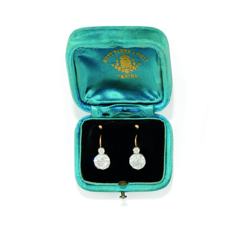 Risalgono alla fine dell’800 il paio di orecchini e il bracciale in diamanti (lotti 185 e 186), proposti a partire da 6.000 Euro ciascuno, e agli anni ‘20 del secolo scorso il pendente-spilla traforato in diamanti che andrà all’asta a partire da 4.000 Euro (lotto 23): questi gioielli portano la firma di quella che allora era la più antica gioielleria d’Italia, e tra le più longeve d’Europa, fondata a Torino nel 1707 da Giacomo Musy.