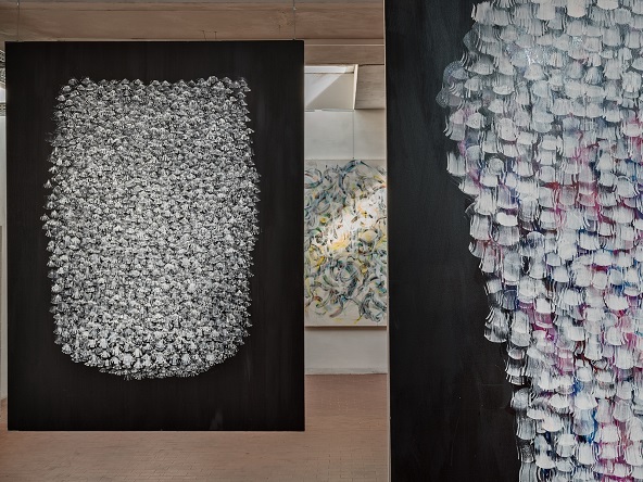«La ricerca di Debora Romei – spiega Leonardo Regano – è legata al medium pittorico, che l’artista studia e analizza nelle sue espressività e potenzialità formali. La mostra presso l’Officina Leo van Moric si pone come un nuovo inizio per Romei, che qui presenta un percorso pittorico rinnovato e aggiornato verso una sensibilità riformata per la materia e una pratica originale. L’incipit di questo percorso di innovazione è dato dal grande trittico AFÌEMI, che troviamo al centro dell’ex officina, un’opera di estremo impatto visivo ed emotivo, in cui l’artista convoglia la propria biografia ed emotività in una pittura materica, caratterizzata dal contrasto tra il bianco e il nero e articolata in segni dalle sembianze biomorfiche».