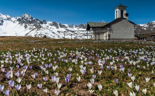 Qui alte vette innevate e laghi ghiacciati lentamente lasciano lo spazio ad ampie distese di crocus bianchi, gialli e lilla mentre in media valle i meleti tornano in fiore per poi dare uno dei prodotti che contraddistingue la Valtellina, ovvero le mele.