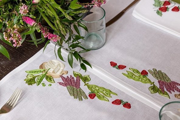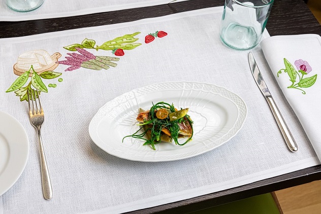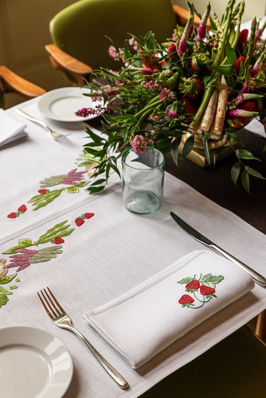 Valorizzando l’unicità della stagione della rinascita, i capolavori artigianali firmati da Loretta Caponi per il ristorante Irene trasformano la mise en place ispirata alle portate del menu di primavera. Da una parte, impreziosiscono ogni posto tavola con il tovagliato realizzato in spesso lino italiano; dall’altra, ogni tovagliolo è personalizzato attraverso il ricamo realizzato con fili di cotone, combinando elegantemente gli stessi colori tenui delle prelibatezze proposte dallo chef. Lo racconta Lucia Caponi, Direttrice Creativa dell’azienda di famiglia: “I ricami sono disegnati individualmente a mano e ciascun design viene poi perforato utilizzando la tecnica della ’spolvero’: una pratica di preparazione degli affreschi in uso fin dall’antichità, in prestito anche nell’arte del ricamo”.