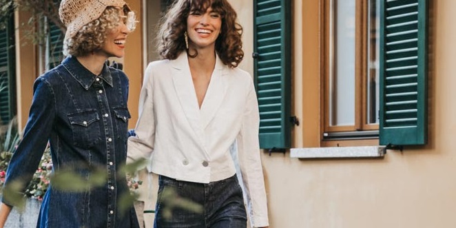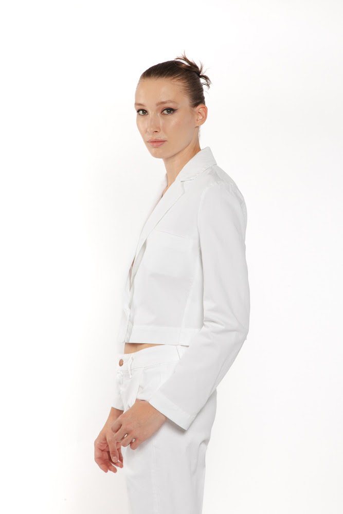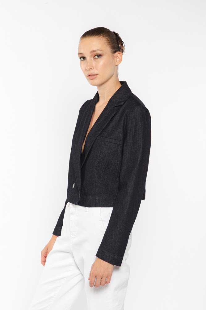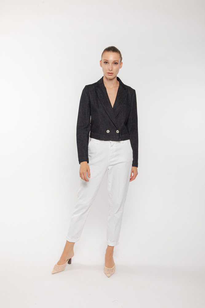 Proposto in denim scuro e in bianco, si porta sia su jeans e pantaloni a vita alta che sopra gli abiti, chiuso e indossato sulla pelle nuda, oppure aperto e infilato sopra top e T-shirt, proprio come facevano i miti dei favolosi Eighties. La leggenda continua.