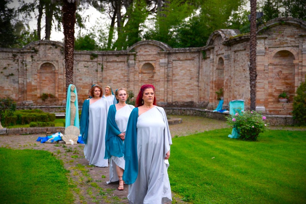 Sculture femminili e gusci di conchiglie, sono state svelate dopo una suggestiva sfilata con i cimbali, danze antiche con ventagli di seta dei colori dell’acqua e la lettura dell’Inno a Venere di Tito Lucrezio Caro tratto dal De rerum natura, in latino con la voce di Sophie e in italiano con la voce di Deborah.