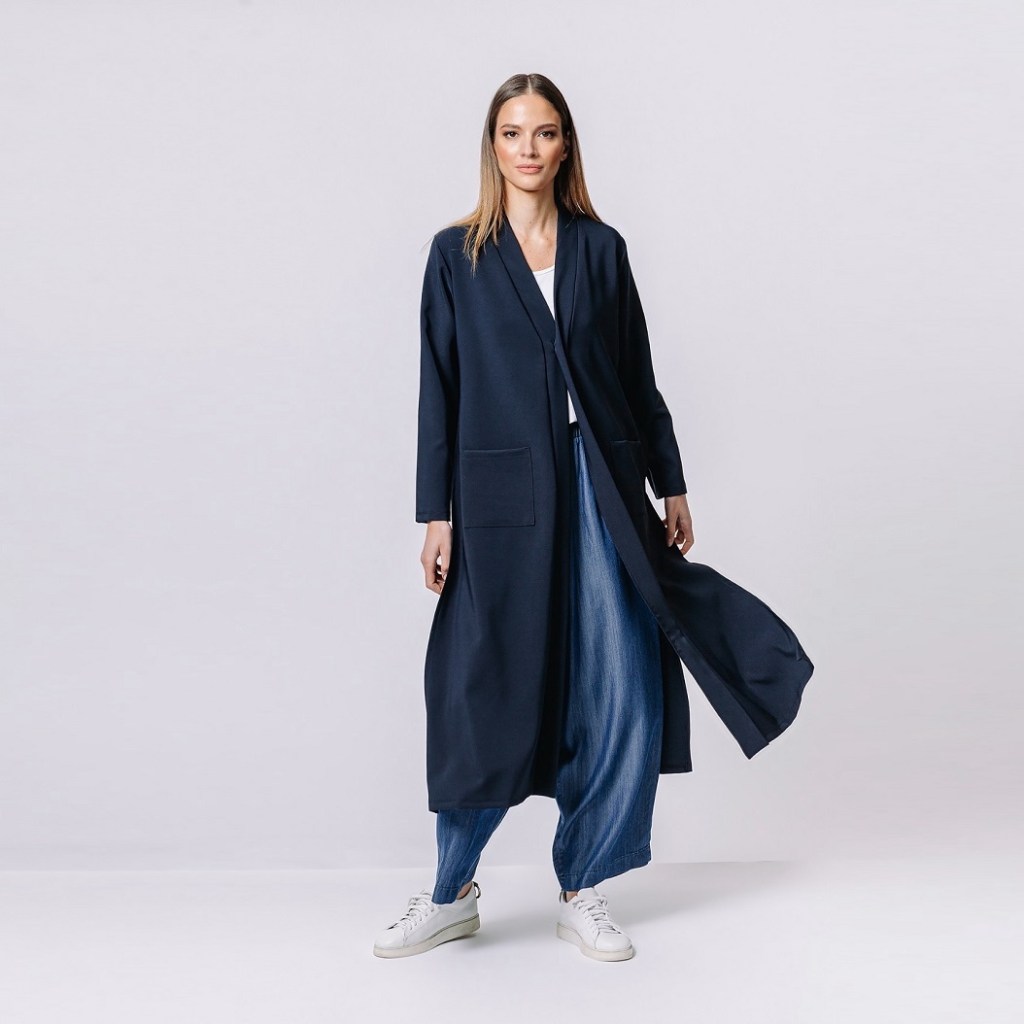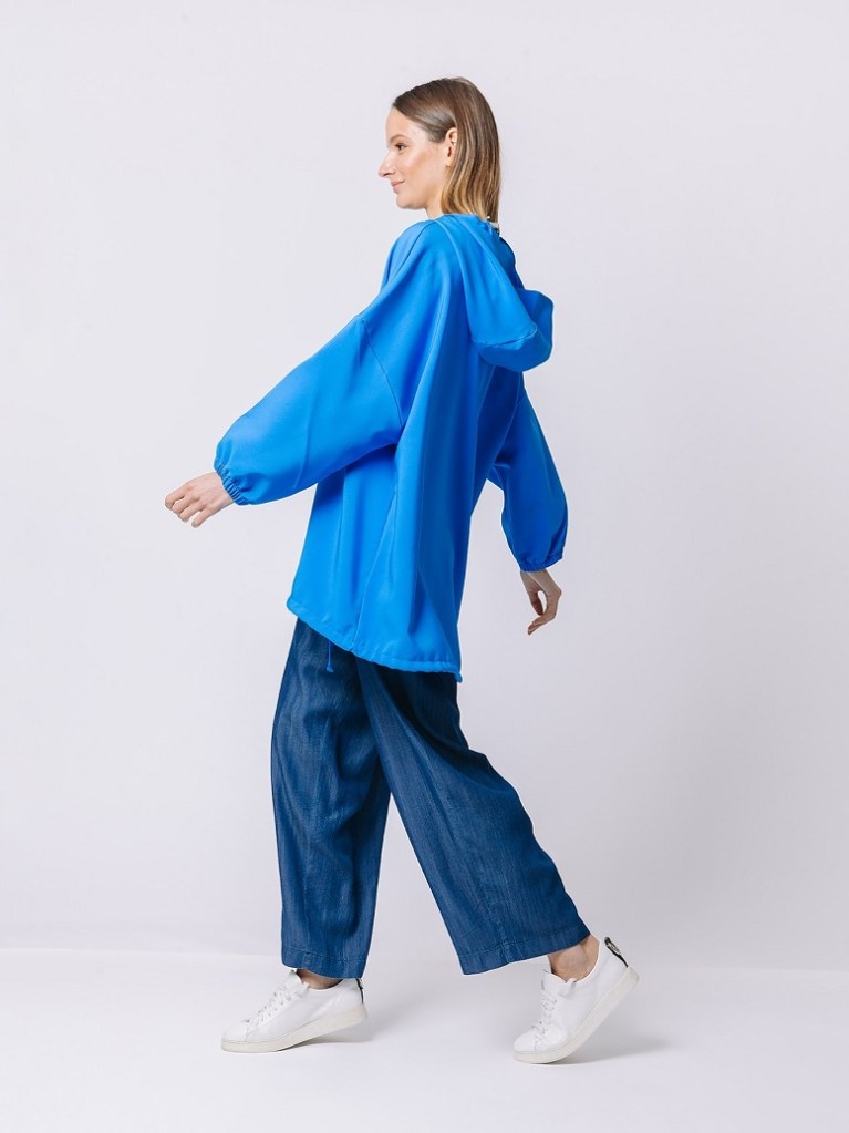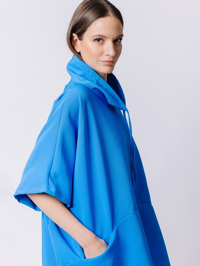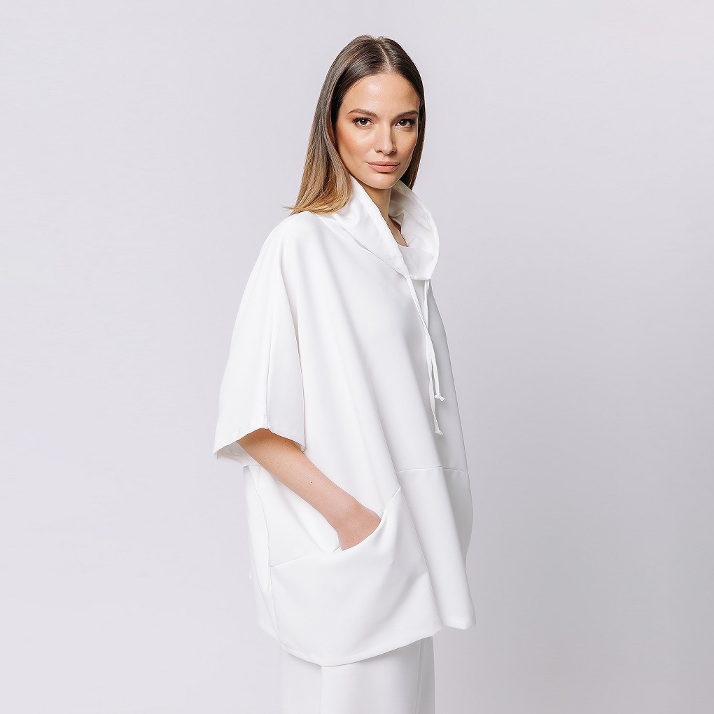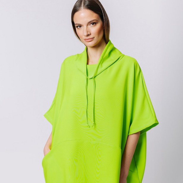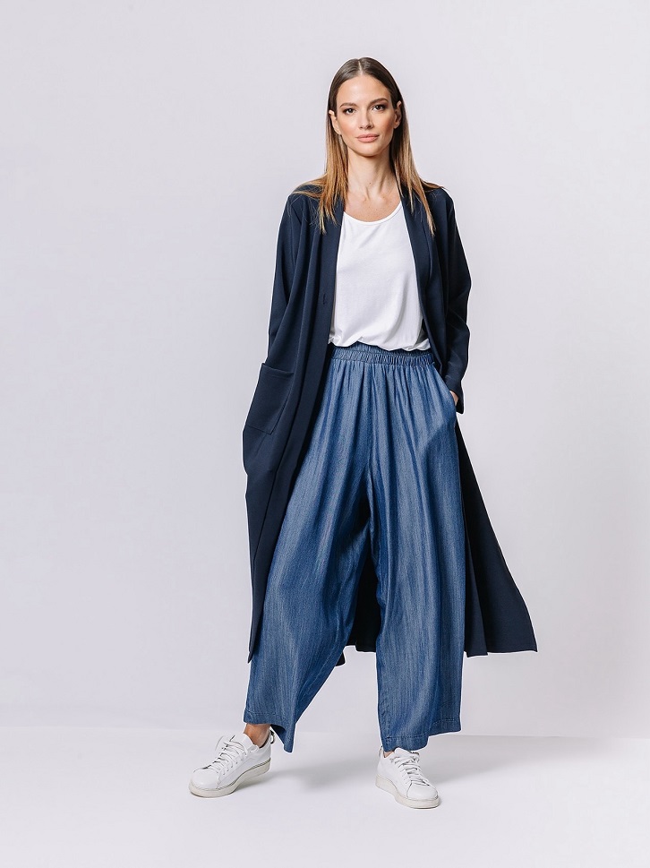 La maglieria torna protagonista: semplici ed essenziali dagli ampi volumi, con e senza cappuccio, proposte in monocolore in lime, azzurro e bianco come i pantaloni le completano, perfette per un look casual, comodo e fresco da indossare con estrema libertà. Silhouette ampie anche per i pantaloni dal taglio sartoriale per evocare una sensazione di quiet luxury, minimal ma allo stesso tempo contemporaneo così come il cardigan lungo, alleato chic per l’outfit di mezza stagione.