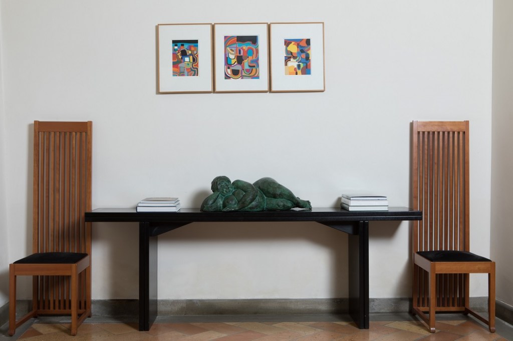Nell’angolo lettura spicca il camino frutto del genio di Giò Pomodoro, divani e poltrone di design e un sistema di illuminazione che valorizza le opere di Mimmo Paladino, Martin Disler e Herbert Brandl.