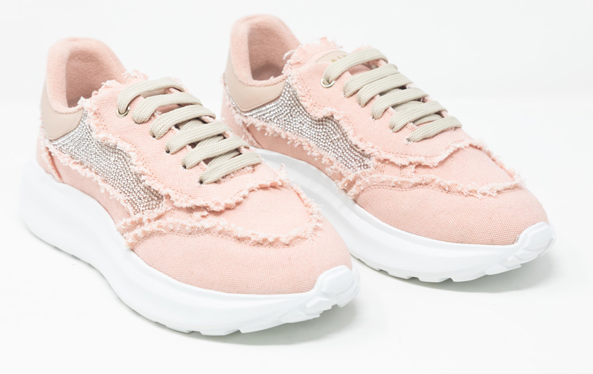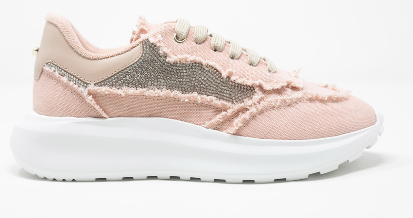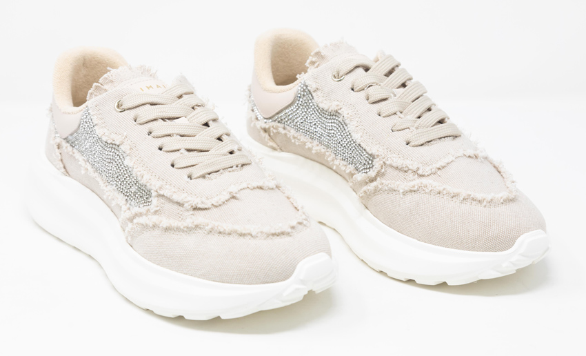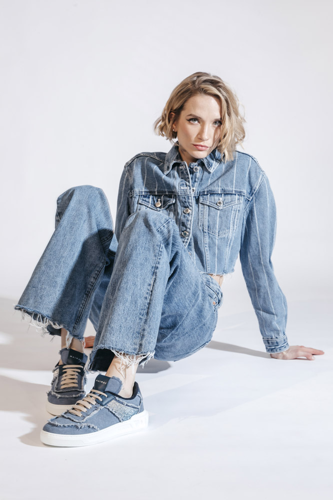 Di contro, però, visto che MAIMAI nasce nel cuore del Salento, straordinaria terra di contrasti che creano un’armonia inattesa e unica, il denim sfrangiato è impreziosito da applicazioni ordinate di piccoli strass degradé, che illuminano il fianco delle sneakers e svaniscono lungo il tallone.