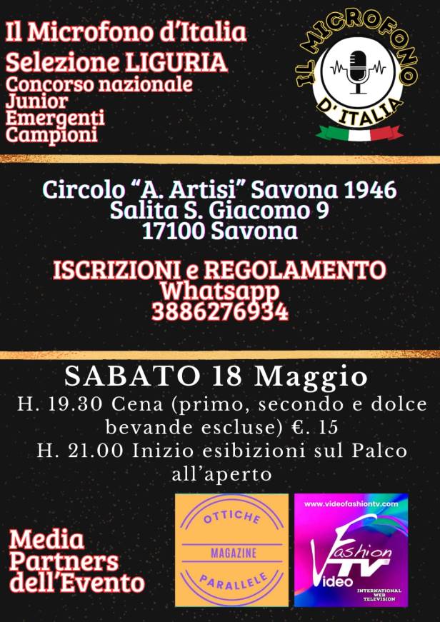 Sabato 18 maggio, alle ore 21, sul palco del Circolo “A.Artisi” Savona 1946 di Savona (Salita S. Giacomo 9) appuntamento con le selezioni del concorso nazionale “IL MICROFONO D’ITALIA”, evento ideato e organizzato da Samuel Accomo dell’agenzia alessandrina SAAS – Organizzazione Eventi – Management Artisti.