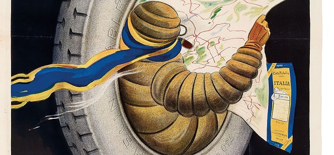Ad aggiudicarselo, dopo un’accesa competizione con partecipanti online e palette in Sala Bolaffi, un famoso collezionista italiano appassionato di automobili d’epoca e di cimeli automobilistici, collegato al telefono. Resta quindi in Italia il celebre Bibendum, mascotte di Michelin, rappresentato nel poster adagiato comodamente all’interno di uno pneumatico mentre studia la cartina stradale del nostro Paese (lotto 46).