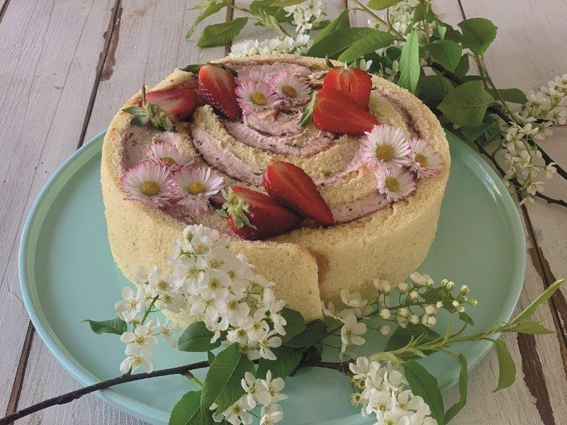 Finito di arrotolare, avrete ottenuto la vostra girella maxi e siete pronti per decorarla con fragole e fiori freschi.