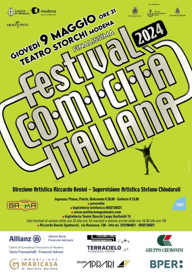 Il Festival della Comicità Italiana di Modena (in passato Festival Cabaret Emergente) con la Direzione Artistica di Riccardo Benini e la Supervisione Artistica di Stefano Chiodaroli, giunge all’evento conclusivo della Finalissima di giovedì 9 maggio, alle ore 21.00, al Teatro Storchi di Modena.