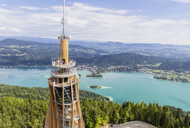Dal lago Wörthersee al parco dei monti Nockberge, dalla valle dei laghi alle cime delle Caravanche, da Villach al monte Dobratsch e da Klagenfurt all’alpe Koralm: il panorama a 360 gradi sul meraviglioso paesaggio di monti e laghi della Carinzia è semplicemente grandioso dalla torre panoramica in legno alta 100 metri, che si staglia sul colle Pyramidenkogel, a sud del lago Wörthersee. Si sale in ascensore, oppure a piedi per 441 gradini, e si arriva alla terrazza panoramica circolare.
