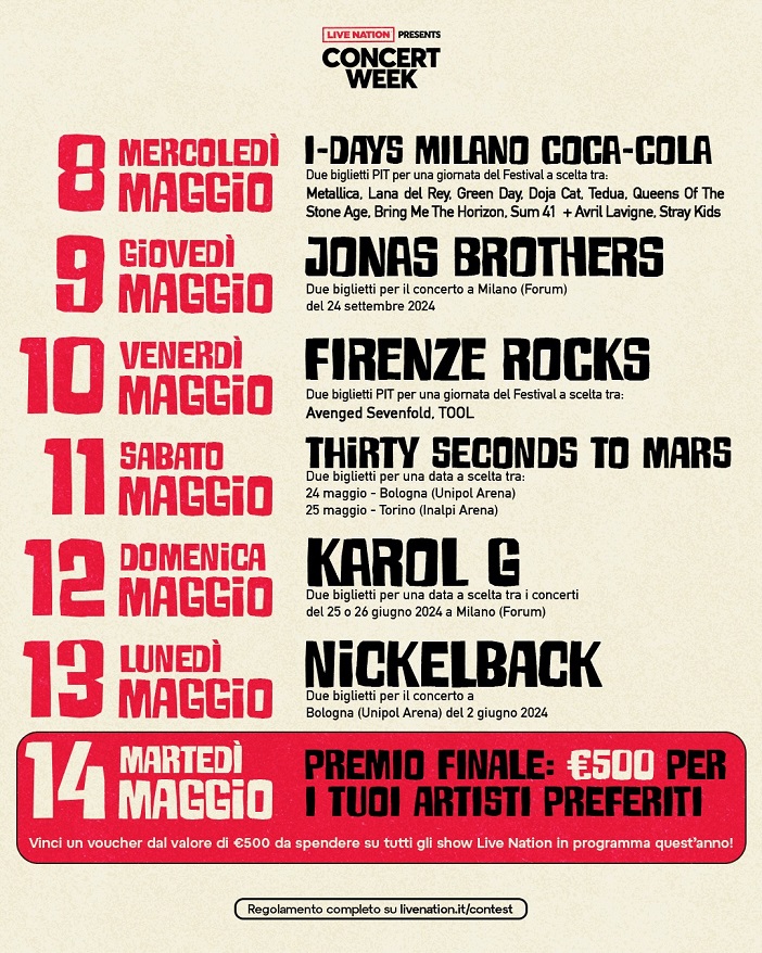 Attraverso il contest “Vinci 7 Giorni di Biglietti“, ogni utente avrà l’opportunità di partecipare per vincere, nel periodo dall’8 al 14 maggio, i biglietti per una serie di concerti in Italia, tra cui quelli dei JONAS BROTHERS, THIRTY SECONDS TO MARS, KAROL G, NICKELBACK, oltre alla possibilità di vivere una giornata a propria scelta ai festival I-Days Milano Coca-Cola e Firenze Rocks.